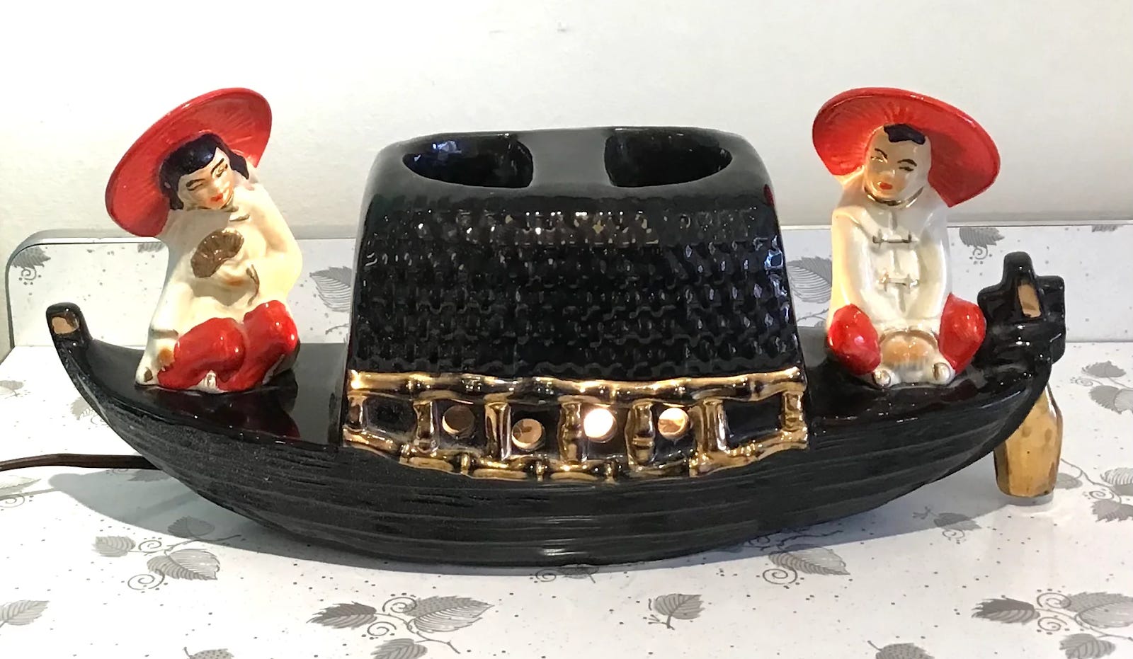 Ceramic sculptural lamps in general also passed out of fashion and into the dustbin of kitsch, whence they’d be rescued in later decades by aficionados of vintage style. Original TV lamps will generally set you back at least $75-$100 now, but my wife and I accumulated a few back when they were easy to find in thrift stores. My heart aches to think of our “Chinese boat” TV lamp which has been sitting in our storage space since we moved out of the US. Someday we’ll be together again… someday…