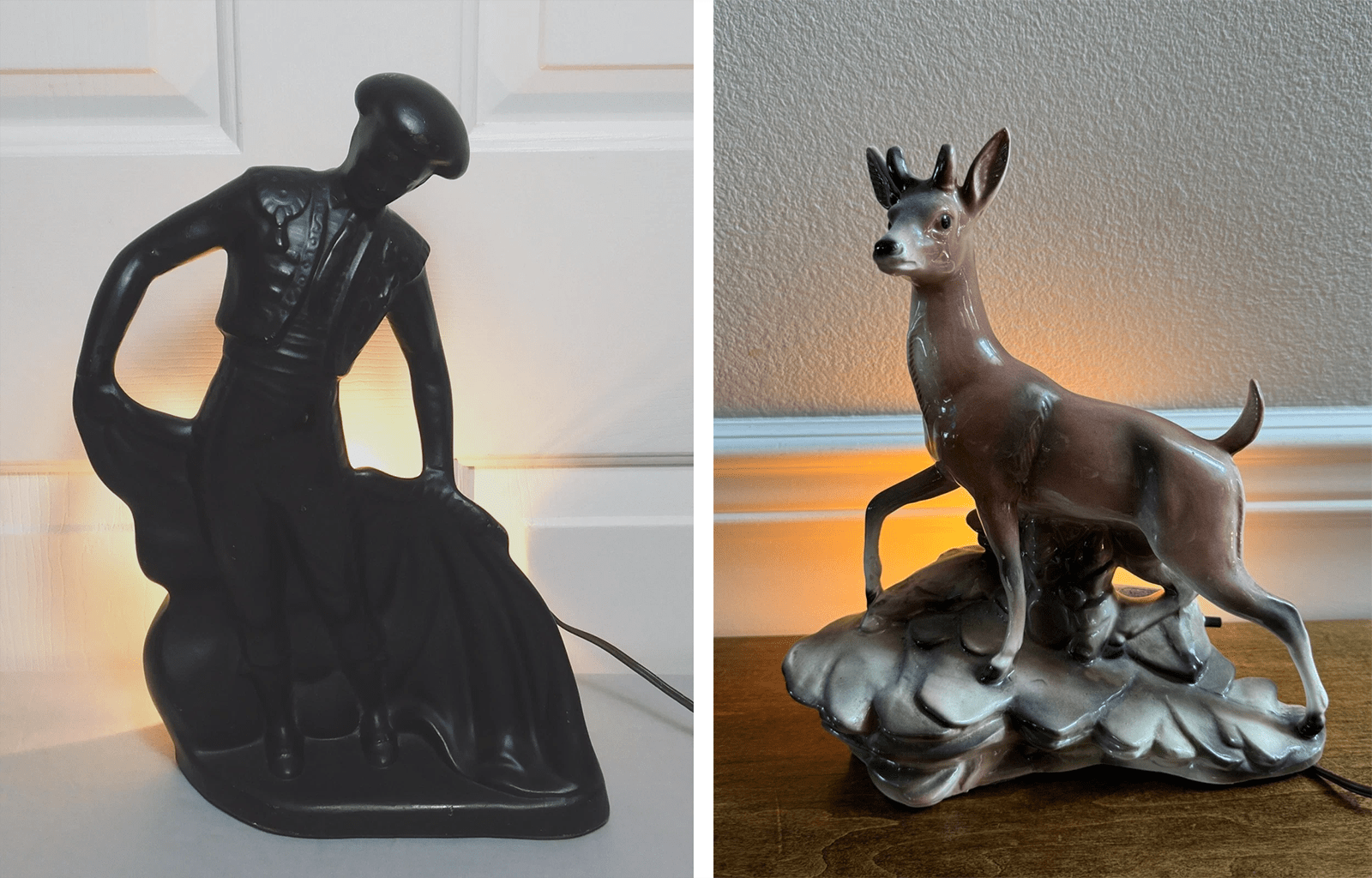 “The figures most often represented in TV lamps were Siamese cats, panthers, dogs, mallards, ducks, swans, and ships,” writes Calvin Shepherd in the book '50s TV Lamps: A Collector’s Guide. There was also a healthy proportion of exotica like matadors, “Chinese” figures, and covered wagons. “These were glazed and painted in popular 1950s colors like green (chartreuse), maroon, white, black, and pink.”