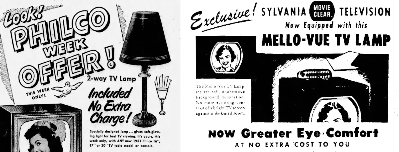 “Clearer pictures! No eyestrain!” blares a 1950 ad for the Maxilume lamp company. “This scientific development approved by leading doctors gives enough light to prevent eye strain but NOT so much that it interferes with vision.” TV manufacturers themselves moved to inoculate their products from the issue, with Sylvania adding a “Mello-Vue TV Lamp” to its models, and Philco dealers giving away a stand-alone lamp with every purchase.