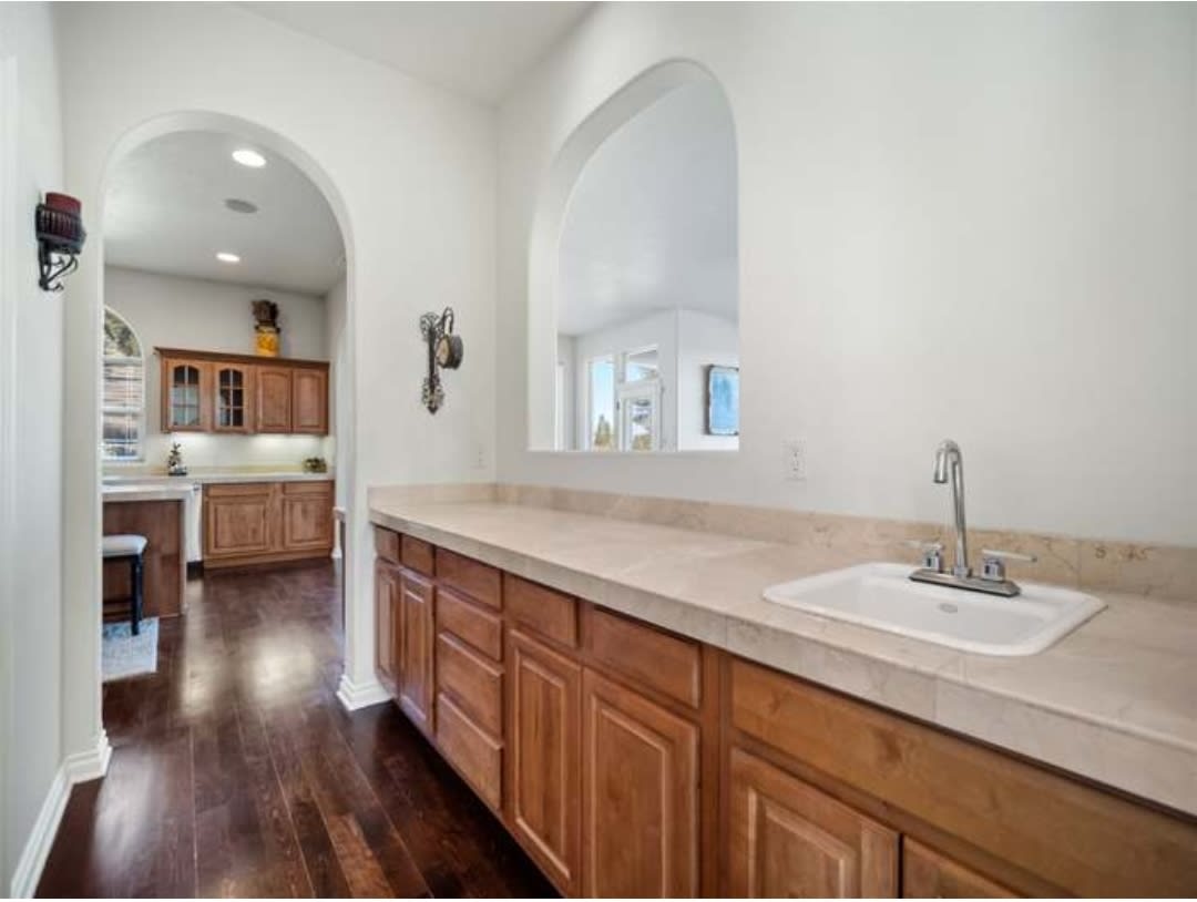 The hallway sink is part of the wet bar; the opening in the wall adjacent is for the caterer’s barkeep to keep the guests lubricated.