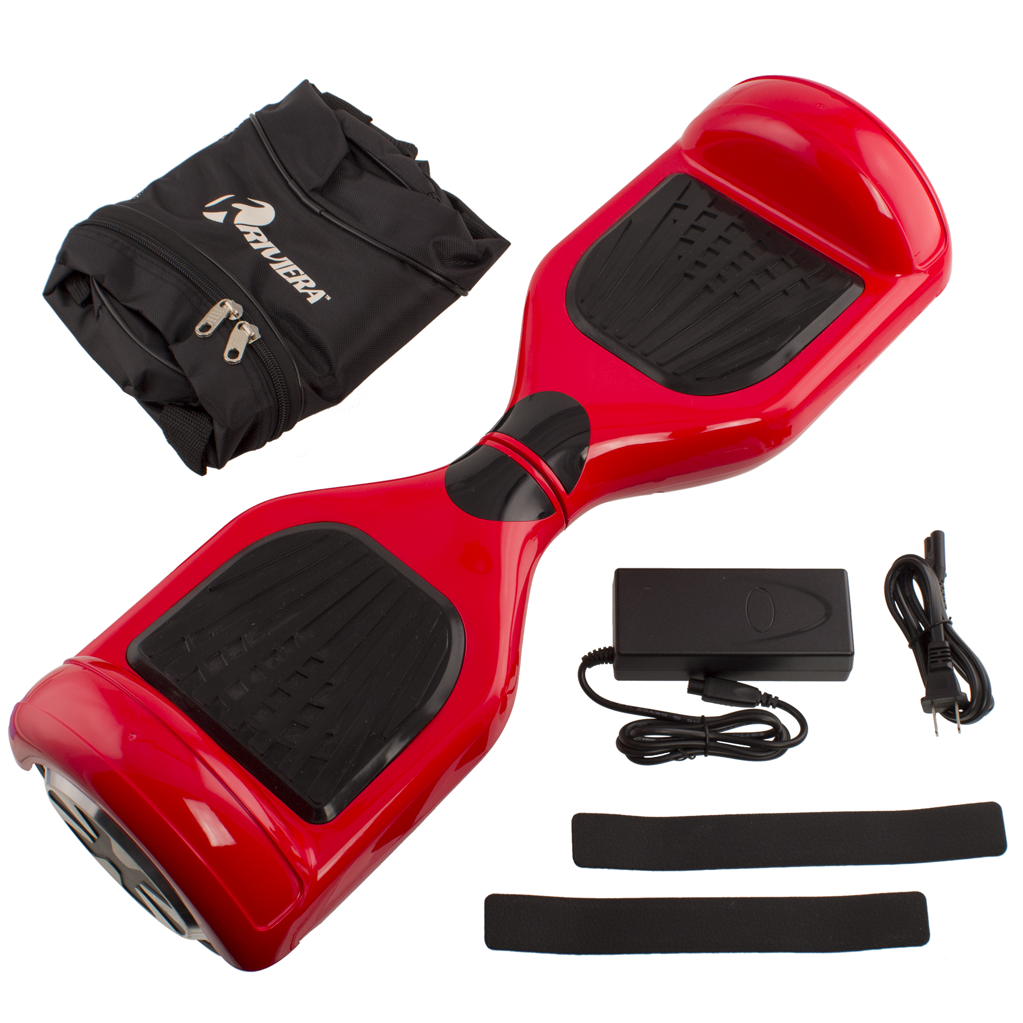 Specs ====- Model: RIV-SBS-BLK, RIV-SBS-RED, RIV-SBS-WHT- Condition: New- 6.5" tires- Dual 250W motors- Samsung 4.4Ah 36V battery- Front LED light power/pressure indicators- 70-120 minutes charge time 8-10 miles range- On/off and low-battery sound indicator- 0-degree turning radius- Max weight: 264 lbs- Max speed: 7.5 mph- Weight: 20.5 lbs- Dimensions: 23.2" x 7.3" x 7.3"What’s in the Box? ====1x Hoverboard1x Charger1x Carrying casePictures====Hoverboard optionsBlackWhiteRedStuffWheelChargingCaseWhat else would it be?Price Comparison====$229.99 (for similar) at Amazon$226.87 at Walmart