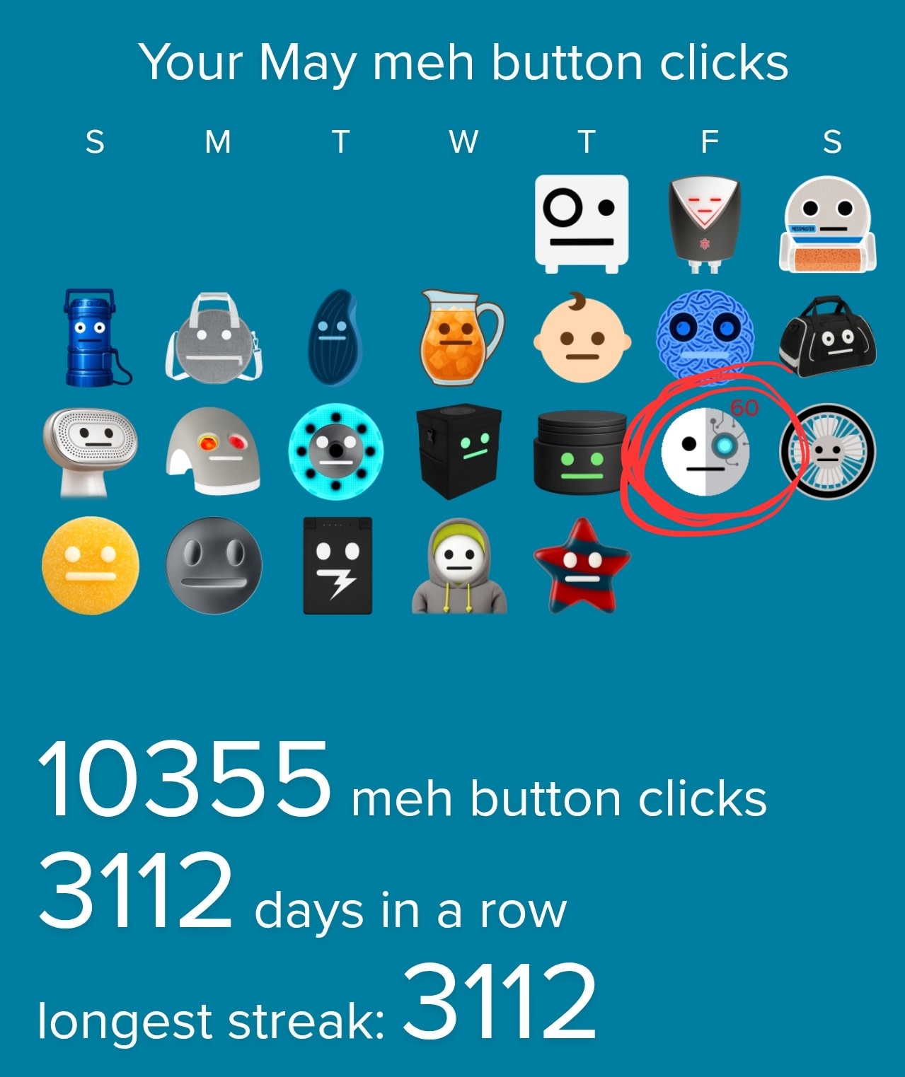 Looking at your profile I’m seeing daily clicks of the “meh” button EXCEPT for May 5th which aligns with your 16-day streak. And so the 666 is your total clicks since you joined and includes those extra clicks on mehrathon days.