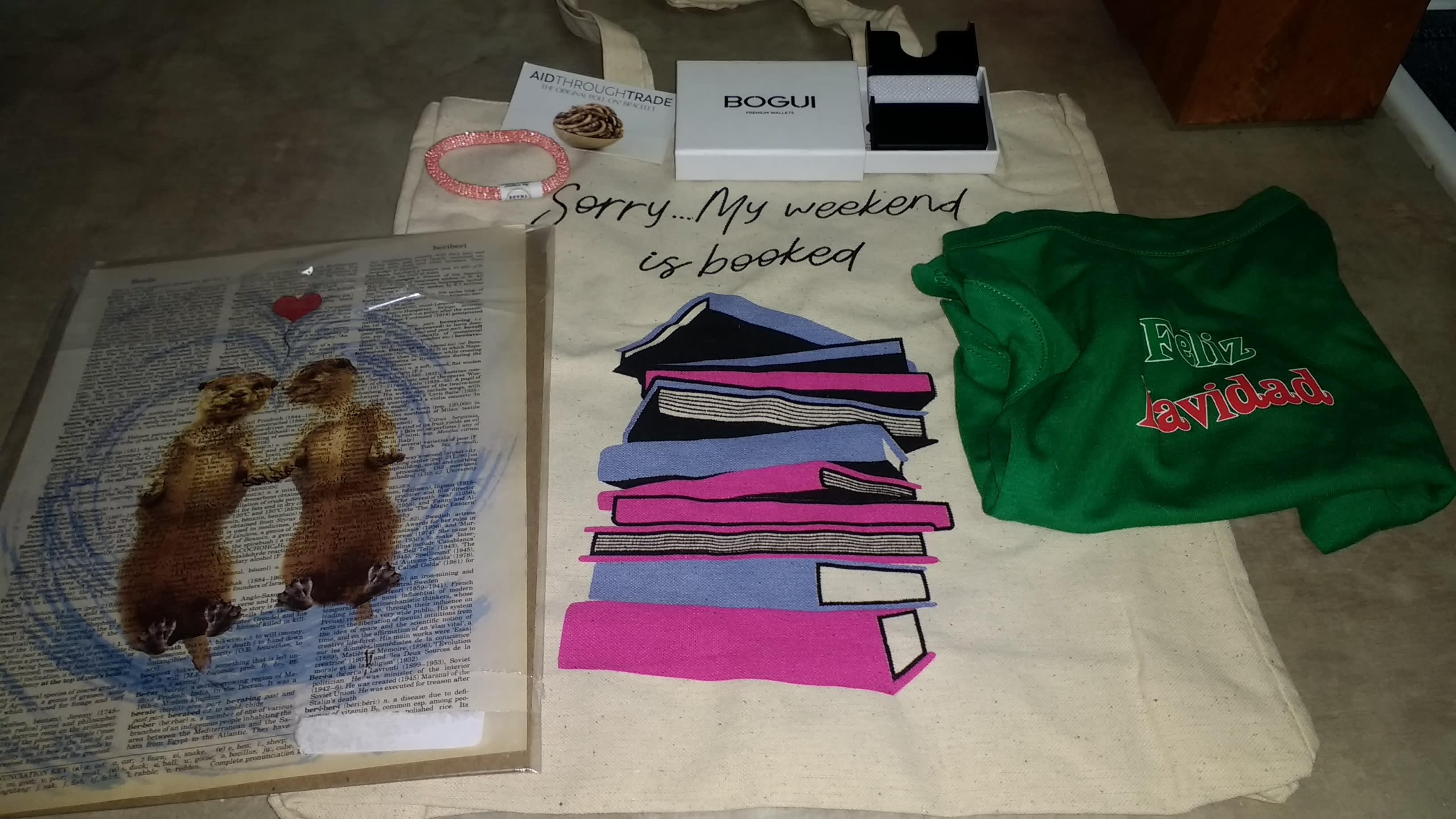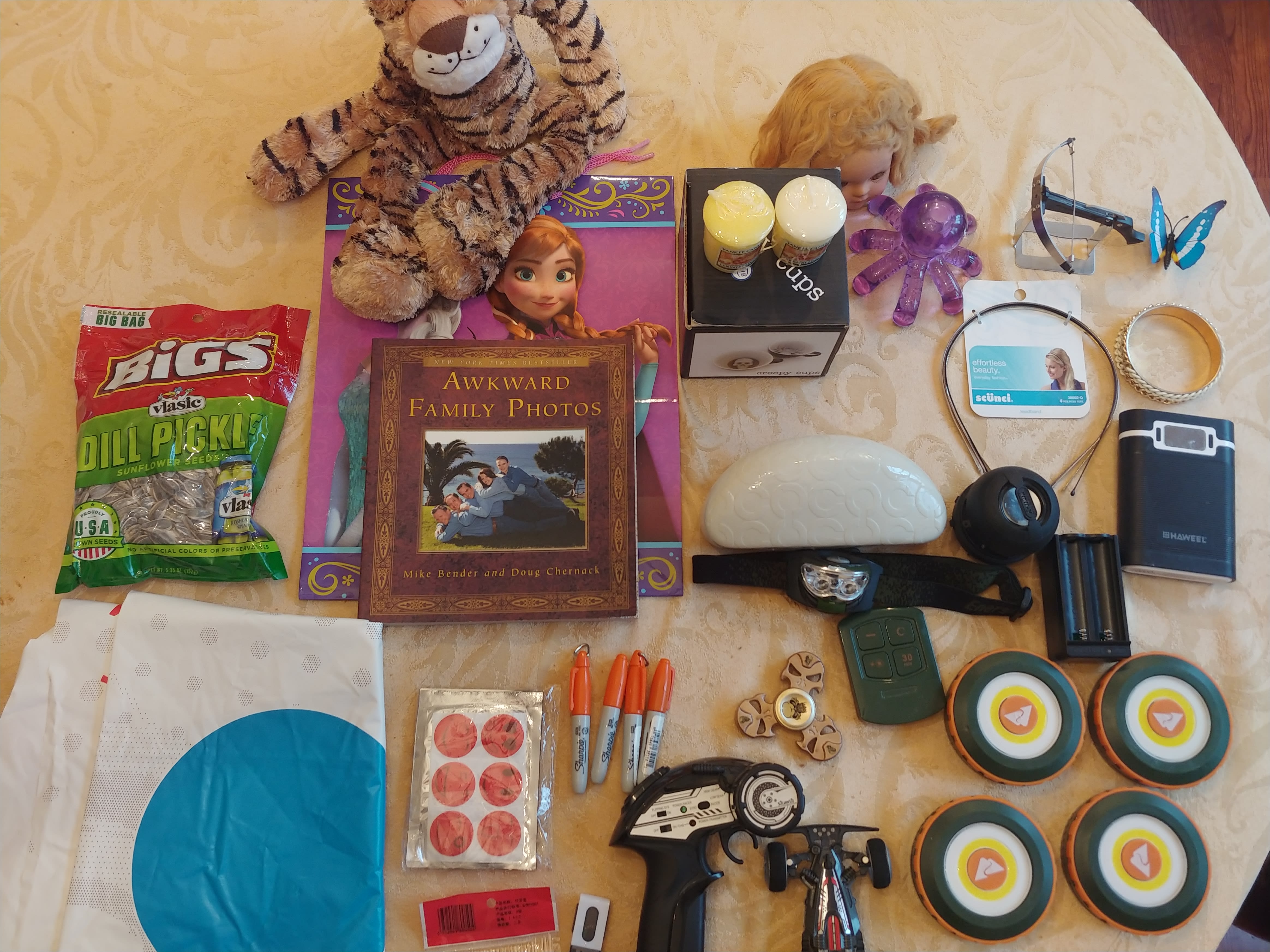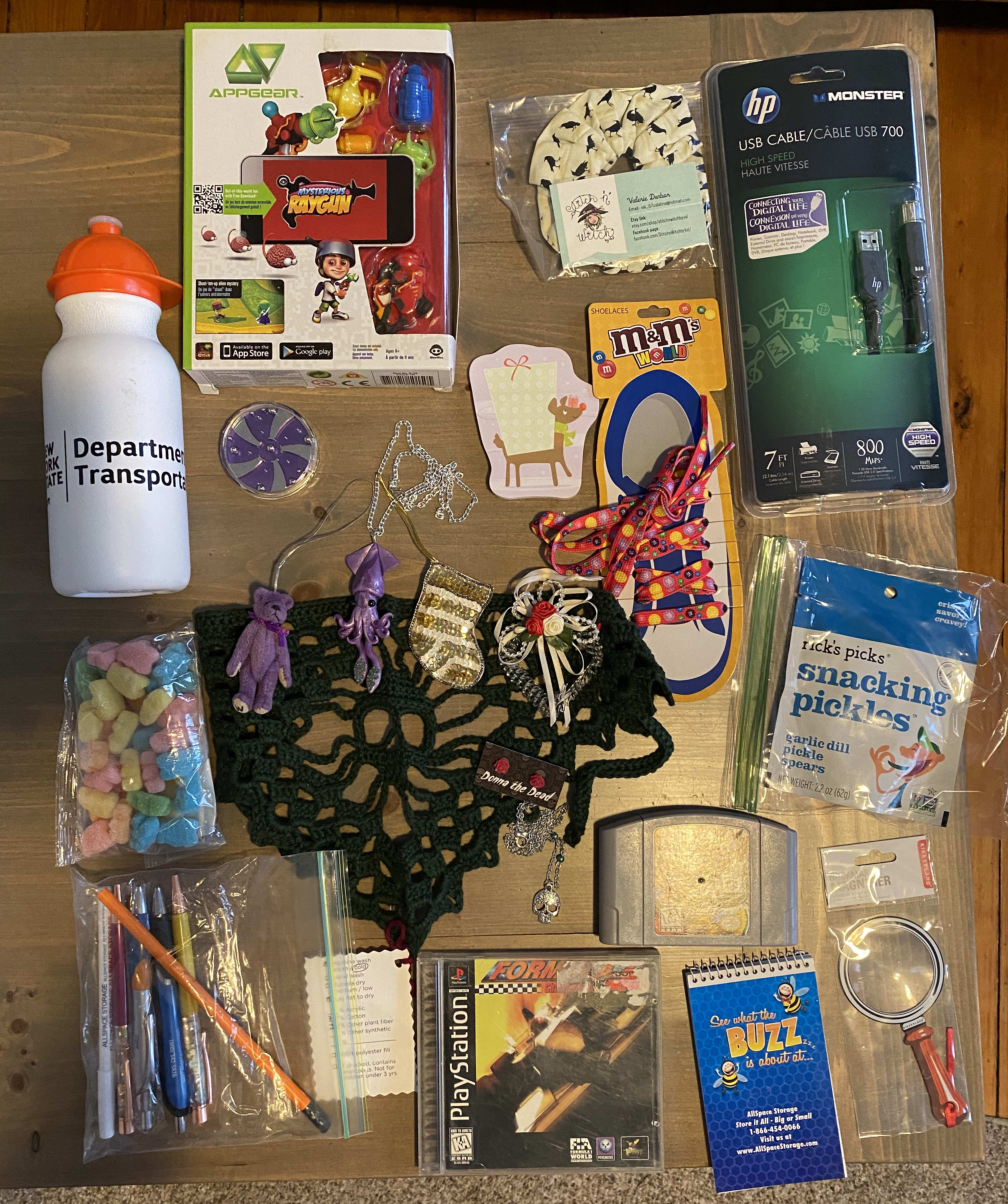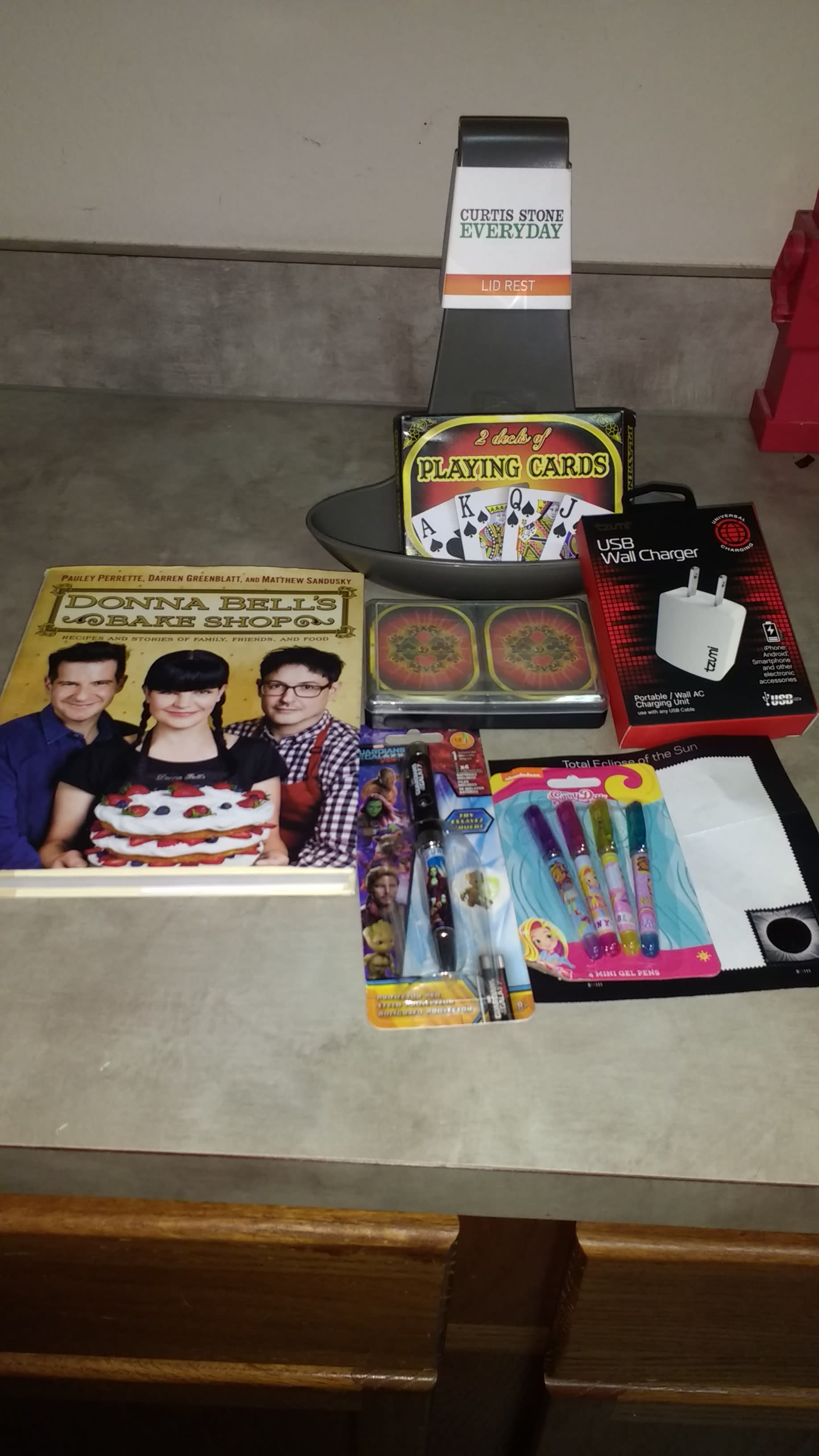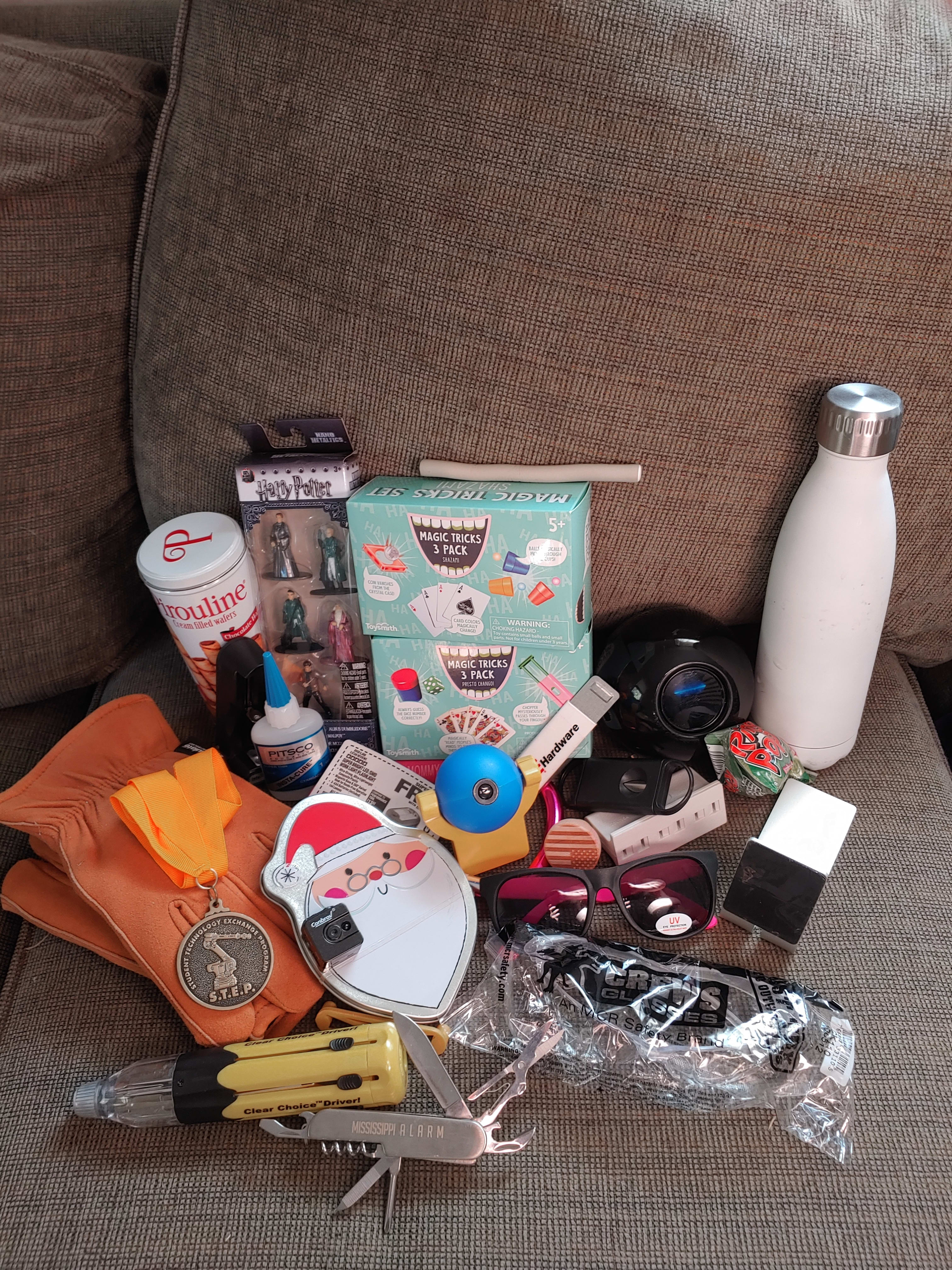 Airheads candy (several dozen?), Necco candy, bag of miscellaneous foreign coins, shredded cash money, nice insulated bag, alien crazy straws, 2 pairs of “Google goggles”, cd titled "Christmas Gone Wrong, a beautiful purple Mario shell, hula girl, mizu travel mug, led flashlight, wacky erasers, cubicaller- the cubicle doorbell, kurv stand for phones, death by gameshow steam download card, einsteinien sticky notes, scatterbrained trivia book, bebe yoga mat/blanket thing, a slimer and minion toy, 2 fidget spinners, case and 2 extra packs of 1992 edition muscle cars cards, and case and 2 extra packs of hitchhikers guide to the galaxy cards.