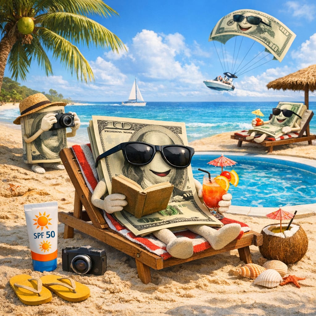@cfg83 Here’s the image you requested for “Money enjoying a vacation”