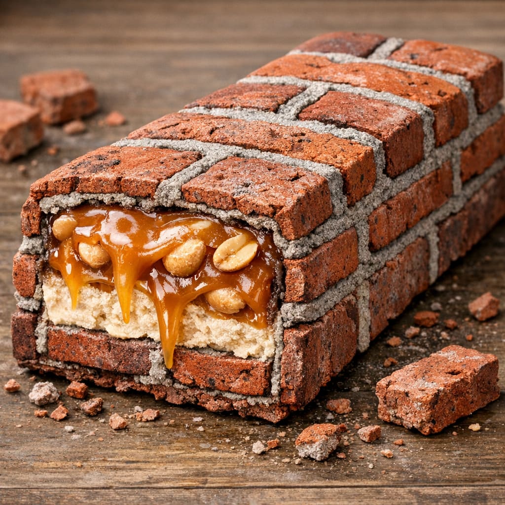 /showme a delicious full-size candy bar made out of brick and mortar with nougat, caramel and peanuts added for extra flavor.