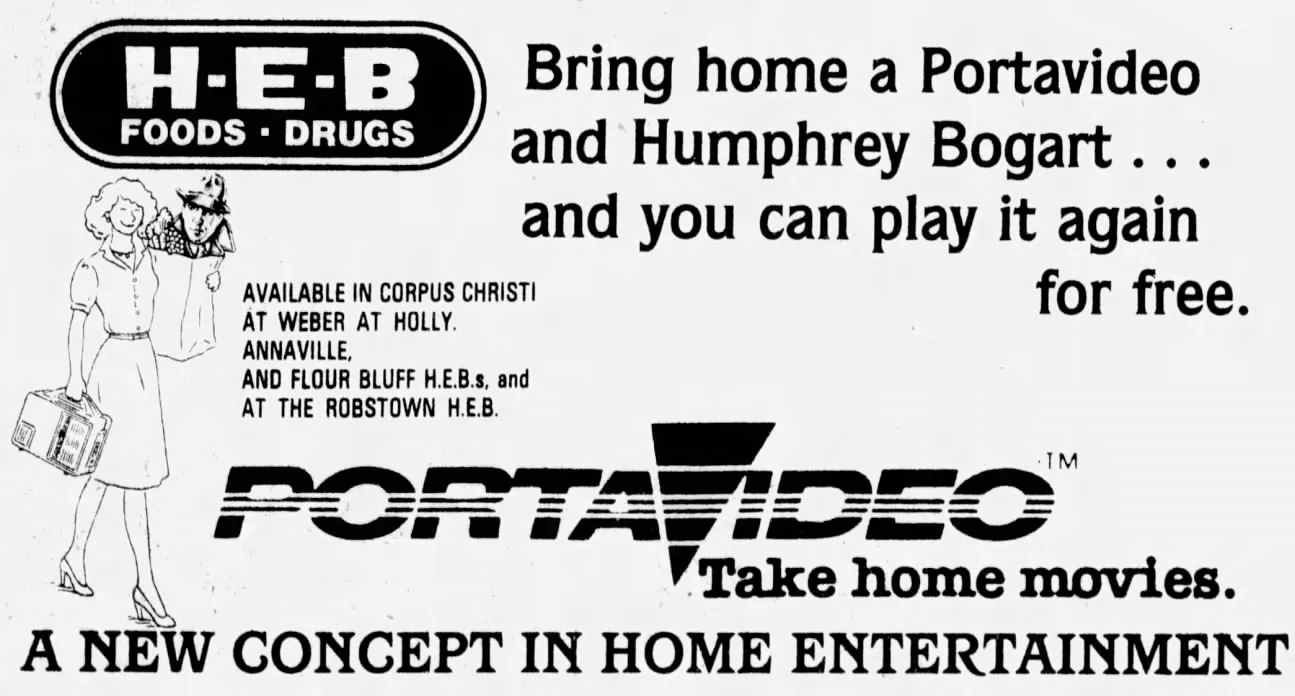 In 1983, Phoenix-based Portavideo rolled out its own plastic-encased rental player, but without the one-movie, one-viewing restrictions of Rentabeta. “Bring home a Portavideo and Humphrey Bogart… and you can play it again for free,” their ads promised.