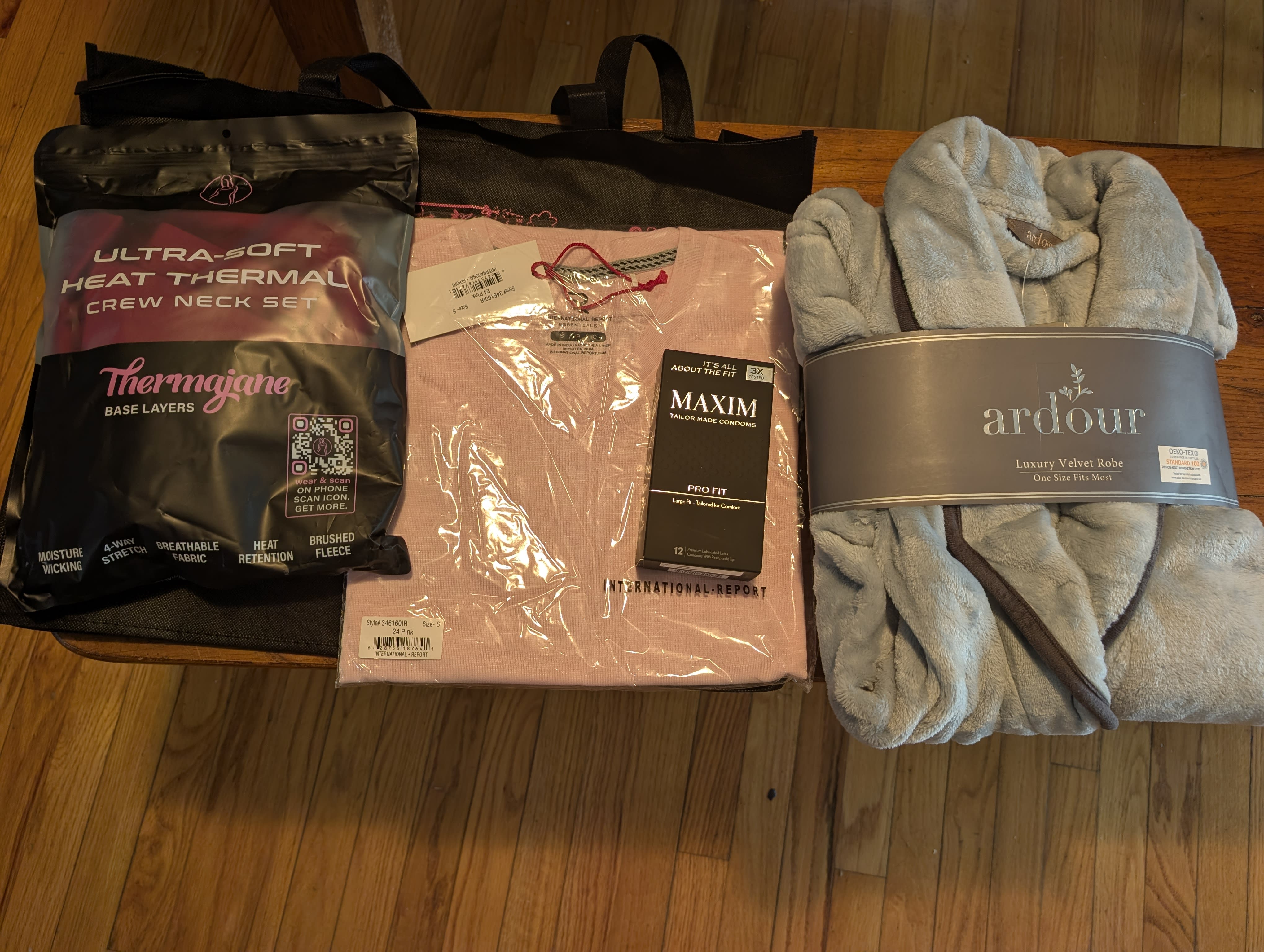 A set of those silky polyester thermal underwear that others got. These red size medium beauties have been claimed by my sister. They’ll be great for keeping her warm while tending to the horses and barn chores with my niece.