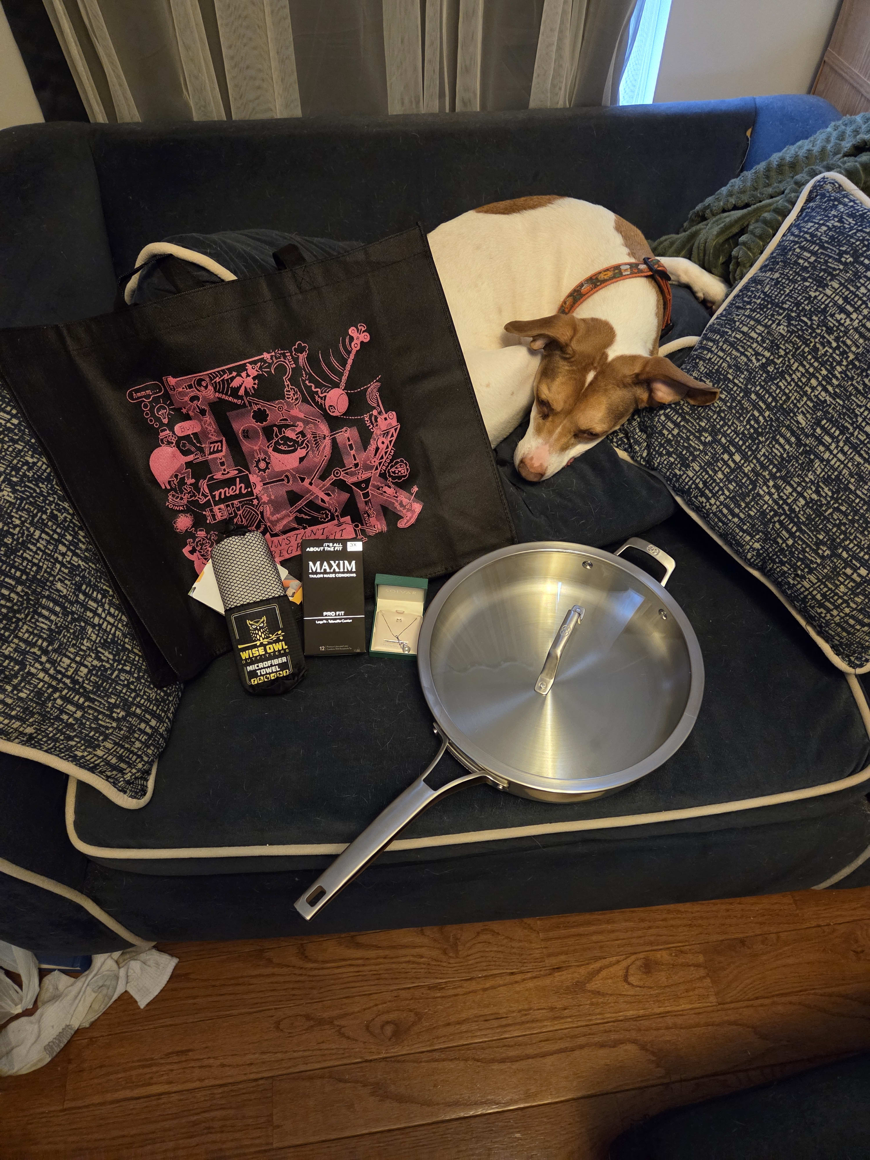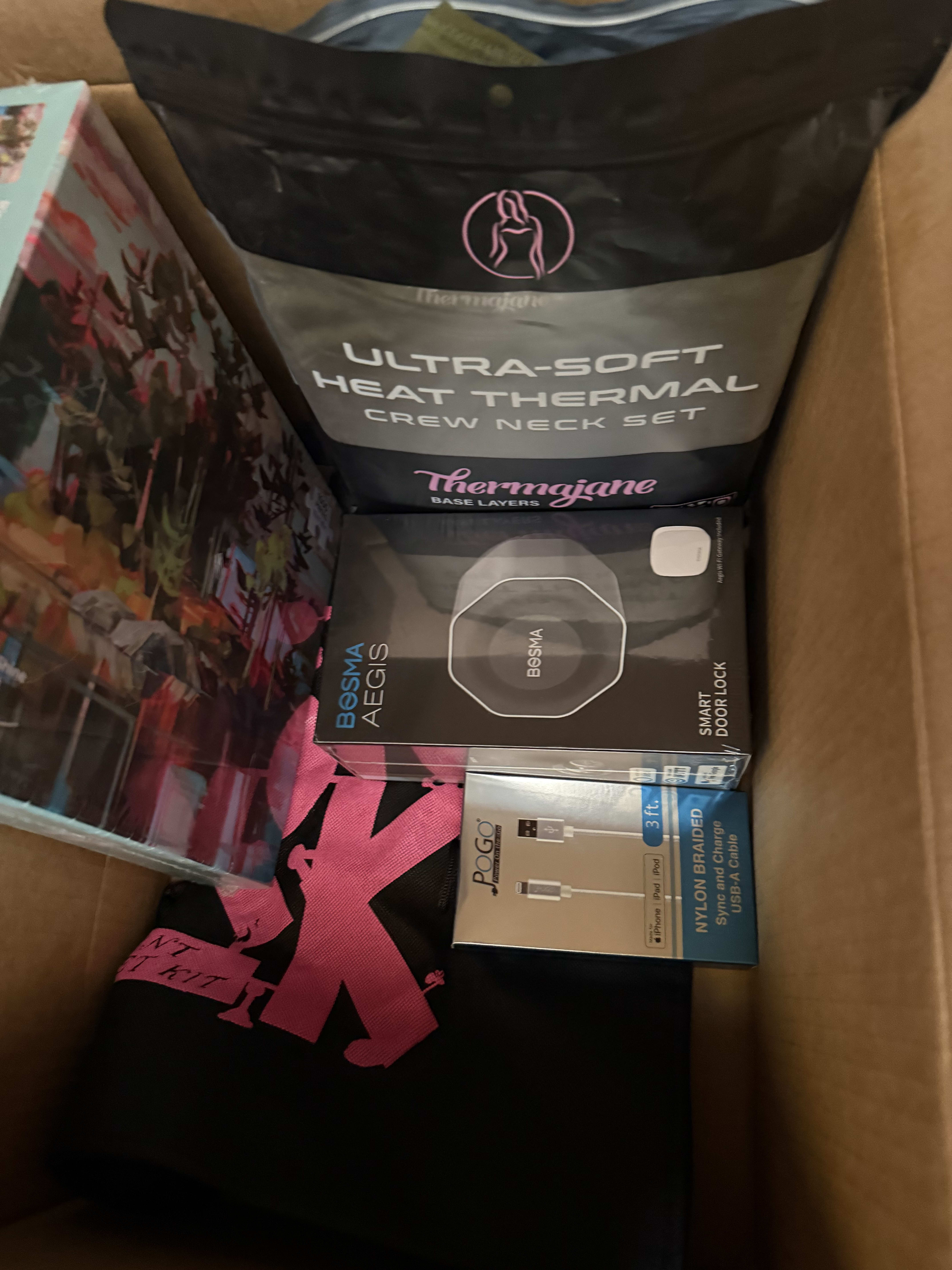 Why yes indeed, there is a puppy potty training mat, no pups here, along with a small pink shirt which won’t fit any of us, a lightning cable which my brother-in-law might still have a use for, and the pink on black IRK bag.