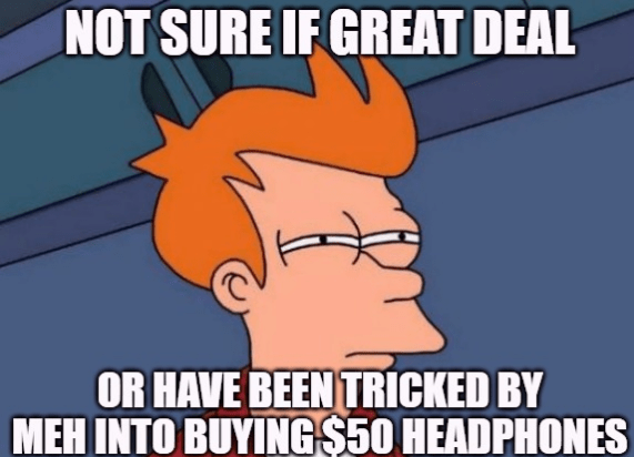 Nothing on Meh has ever piqued my interest to the point of buying. I literally googled a bunch of the details, cause I thought this was surely too good to be true. Super-advanced $400-$500 headphones for $50? If it got five stars at that price, I had to impulse buy a pair. Honestly super excited for them to arrive!