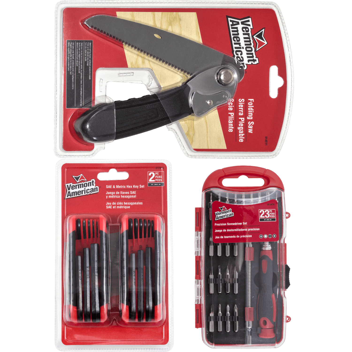 Specs ====- Model: 014511- Model: 013476- Model: 012122- Precision Screwdriver Set includes:- Precision screwdriver, extension bit holder, 21 precision screwdriver bits- Saw is ideal for cutting drywall, wallboard, plywood, or plastic- Blade is 6 inches long- Blade folds out and locks in place- SAE Hex Key Set includes:- 5/64, 3/32, 7/64, 1/8, 9/64, 5/32, 3/16, 7/32, 1/4 in- Metric Hex Key Set includes- 1.5, 2, 2.5, 3, 4, 5, 6, 8 mm- Made in China Condition: New Warranty: 1 Year Vermont American Shipping: $5 or free with VMP Estimated Delivery: 1/27 - 1/29What’s in the Box? ====1x 23-Piece precision screwdriver set 1x Folding Saw1x SAE hex key set1x Metric hex key setPictures====The setHex keysSawPrecision screwdriver setSafety first