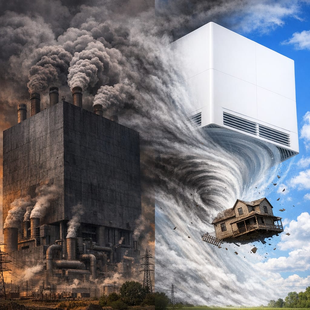 @zippyus Here’s the image you requested for “left side: a giant cube shaped coal power plant, heavy smoke darkening the sky [object Object] ri…”
