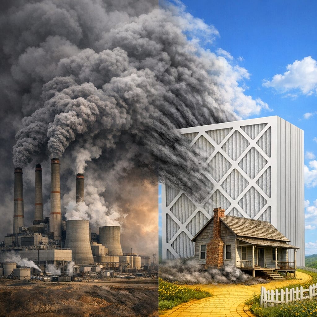 /showme left side: a square coal fired power plant with heavy smoke from its chimneys darkening the sky, right side, a home-style square white air filter as big as a power plant sucking in the smoke and dorothy’s house from the wizard of oz, blue skies above it