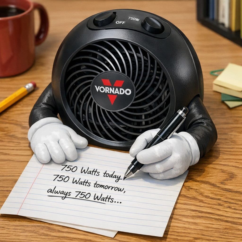 /showme Vornado VH203 Personal Heater has hands and is writing on piece of paper “750 Watts today, 750 Watts tomorrow, always 750 Watts.”.