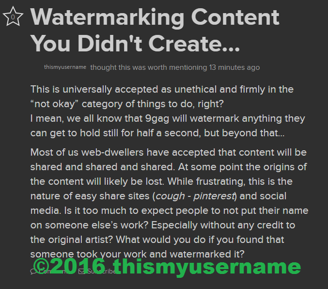 Most of us web-dwellers have accepted that content will be shared and shared and shared. At some point the origins of the content will likely be lost. While frustrating, this is the nature of easy share sites (cough - pinterest) and social media. Is it too much to expect people to not put their name on someone else’s work? Especially without any credit to the original artist? What would you do if you found that someone took your work and watermarked it?