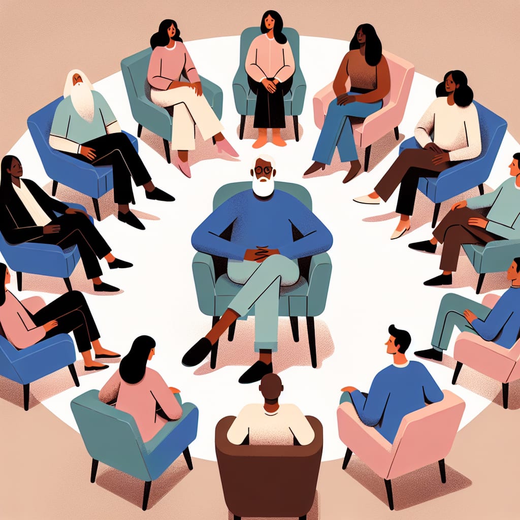 /showme guy named Sam sitting in circle of chairs with 12 people in group meeting. Bad coffee machine in background.