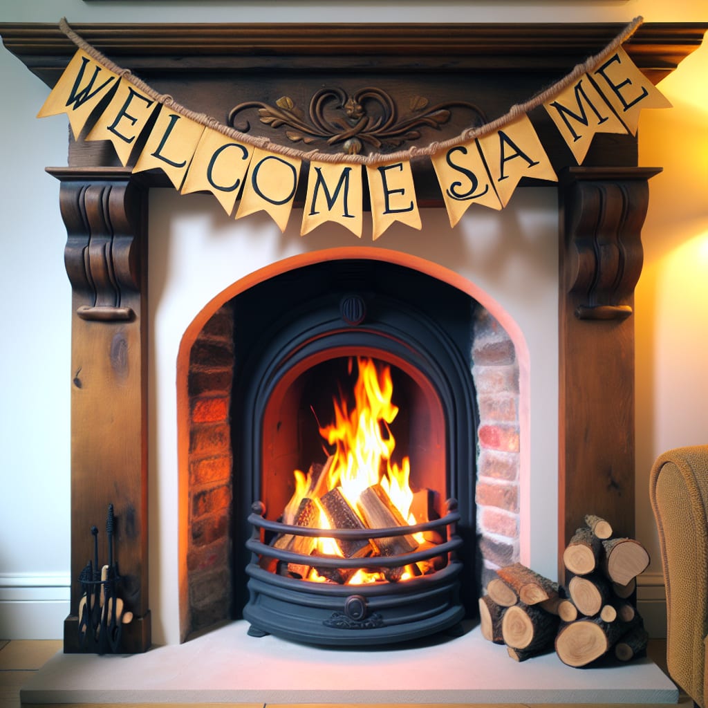 /showme a nice warm roaring fire with a banner above it saying “Welcome Sam”