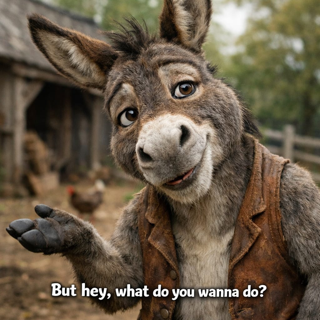 @zappy42 Here’s the image you requested for “permissive inquisitive donkey”