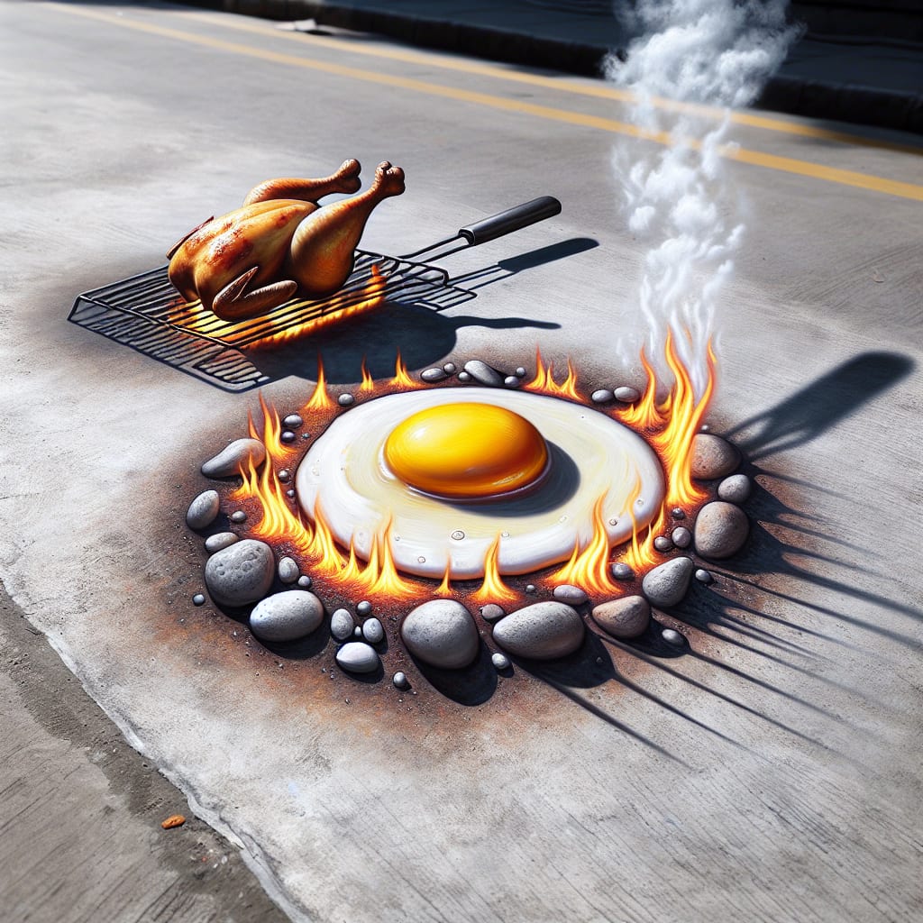/showme Eggs and chicken frying on the sidewalk