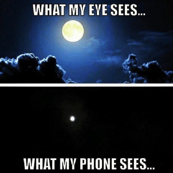 And actually, your eye sees the surface details on the moon, which that camera didn’t. (Some more recent units have smart features to make the result look more like what an eye sees, but still…)