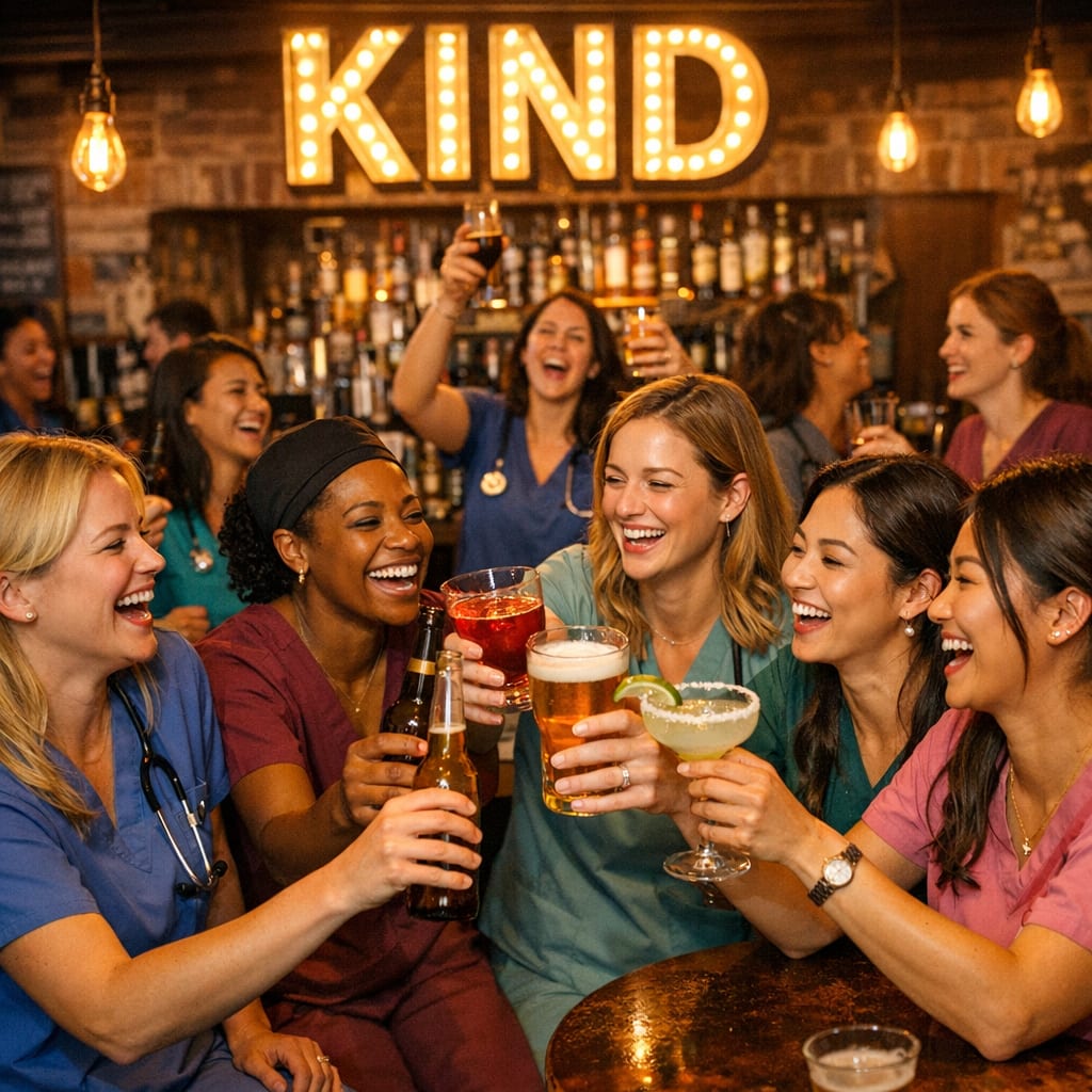 @cfg83 Here’s the image you requested for “A lot of happy nurses off duty drinking at a bar called KIND.”