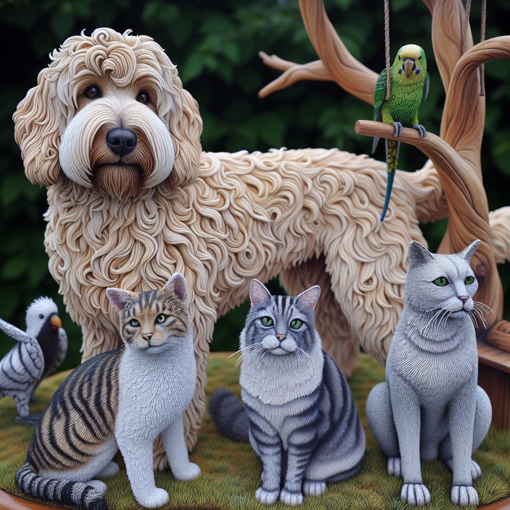 /showme a menagerie containing a labradoodle, a little black and white dog, a gray tiger stripe cat, and a green parakeet named Andrew.