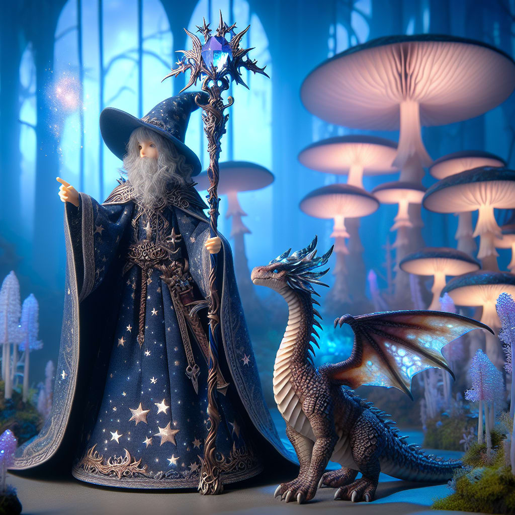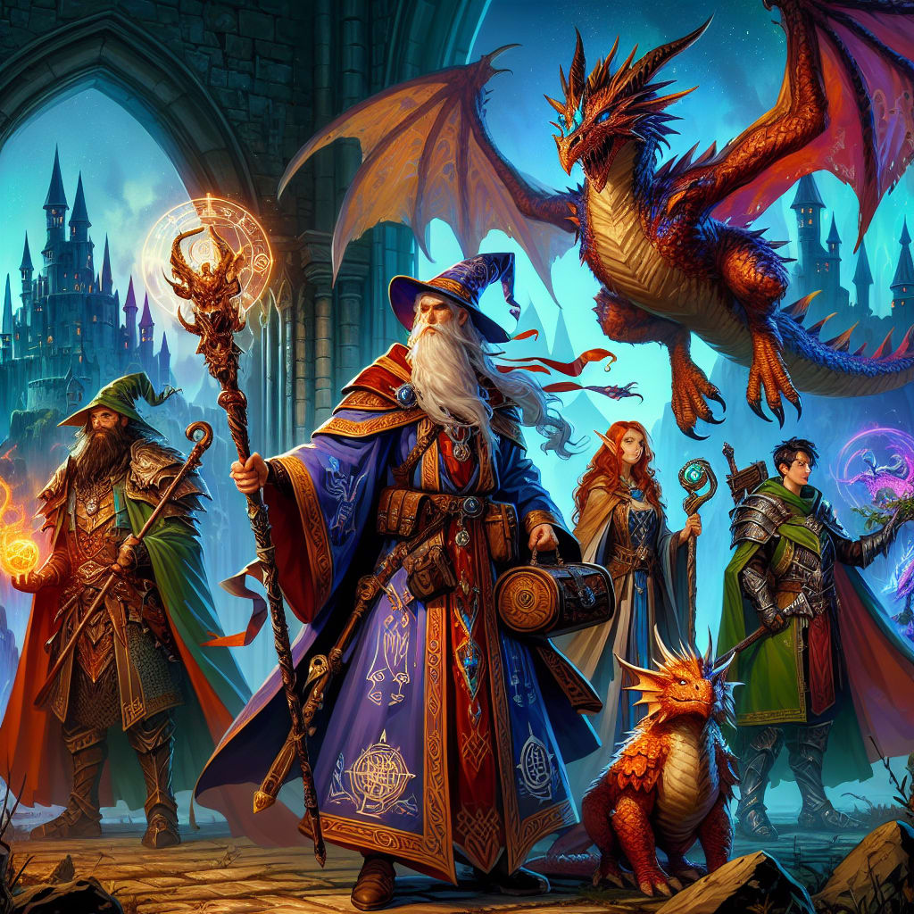 /showme RPG character xobzoo who is a wizard standing with his party which includes a dragon, in a high fantasy style