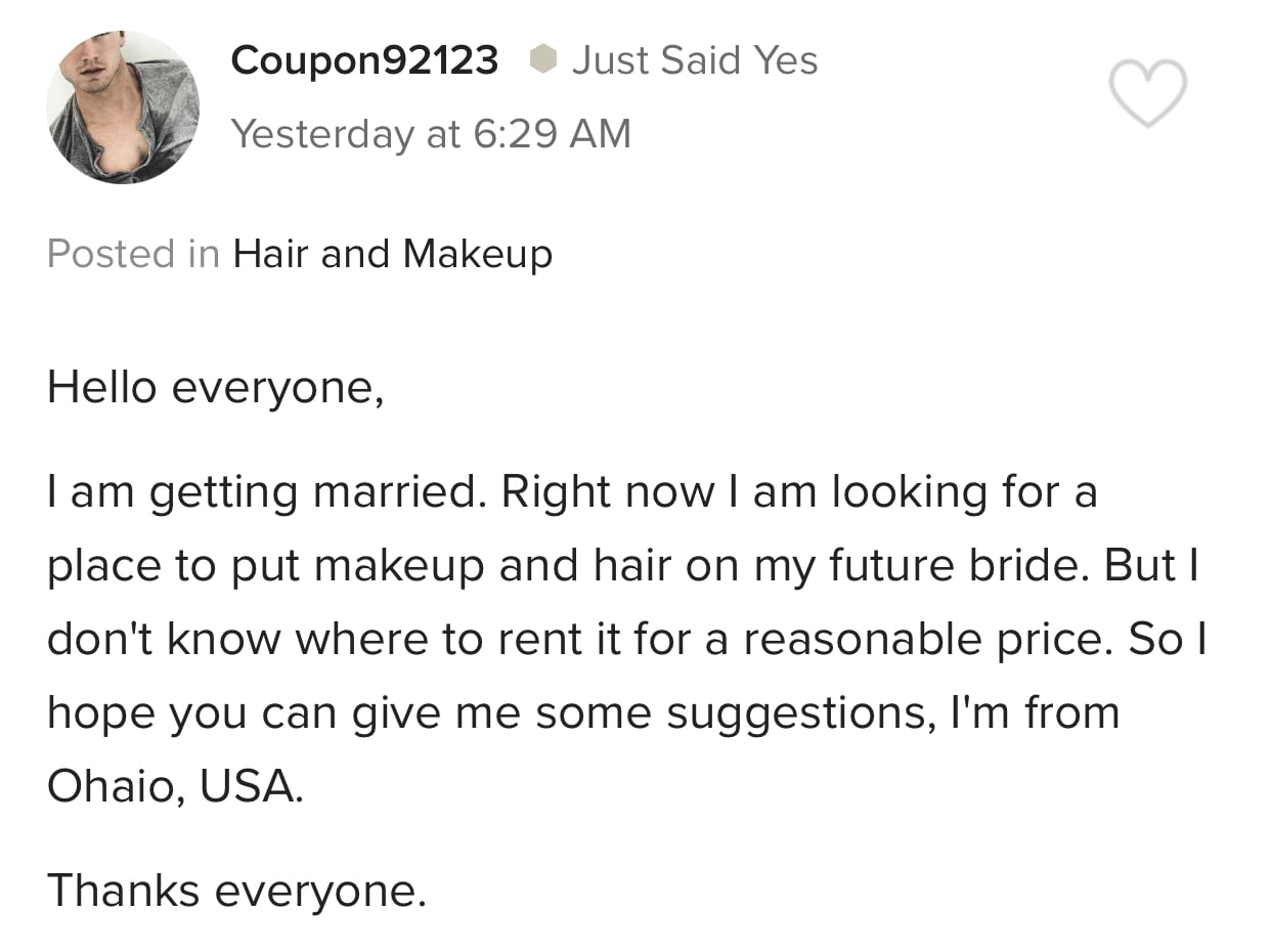 @Coupon92123 for a person, you seem to have had a lot of various questions these last couple weeks…including saying you are married and looking for honeymoon advise, then later saying you are about to get married and looking for a place for hair and makeup.