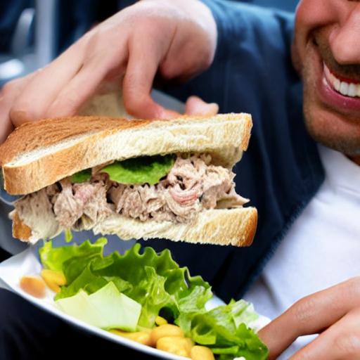 /showme man enjoying tuna salad sandwich on a crowded plane, photo