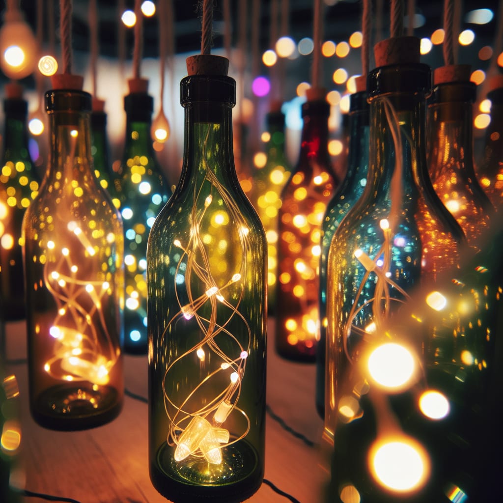 /showme a string of fairy lights that are lighting up the inside of wine bottles