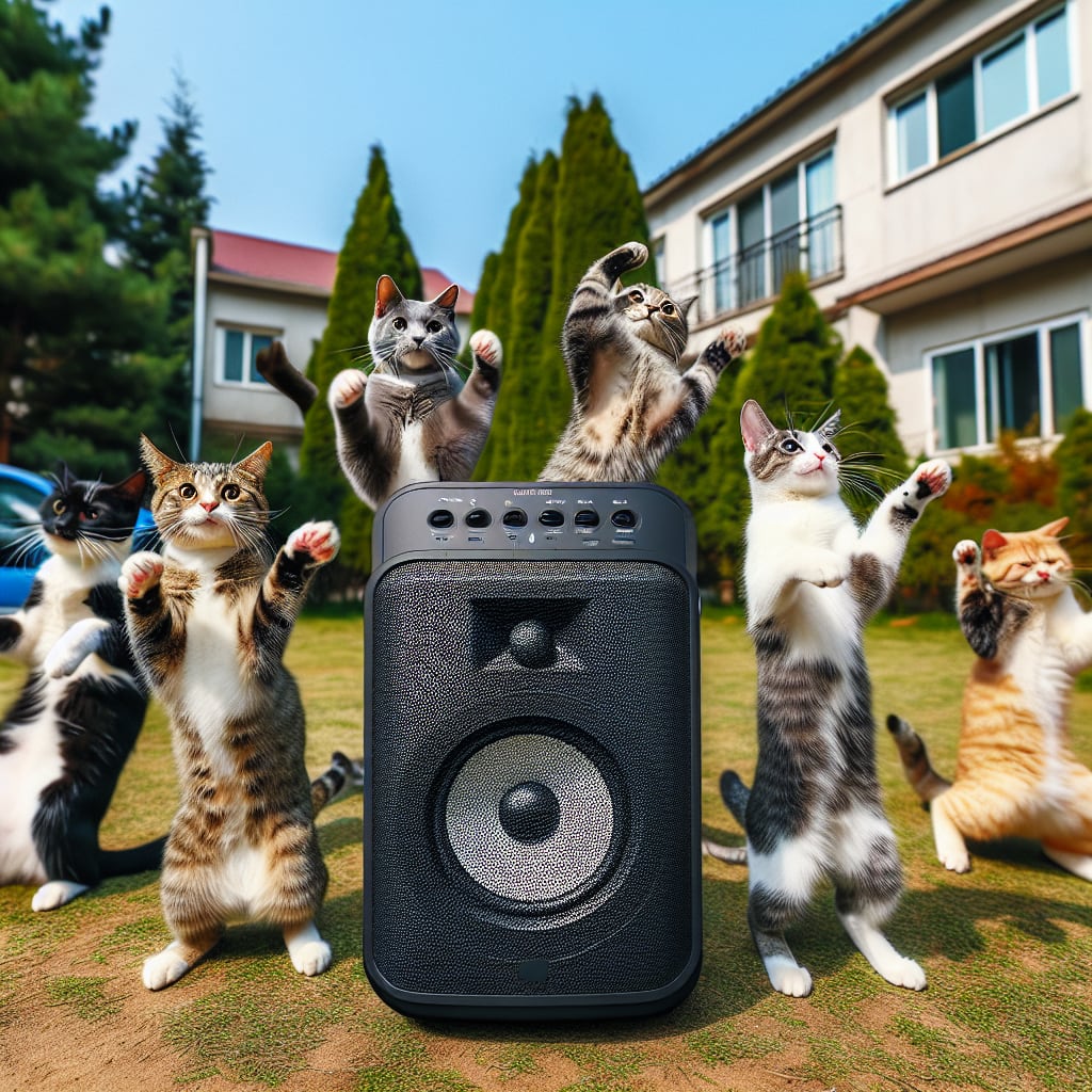 /showme cats listening waterproof speaker and dancing