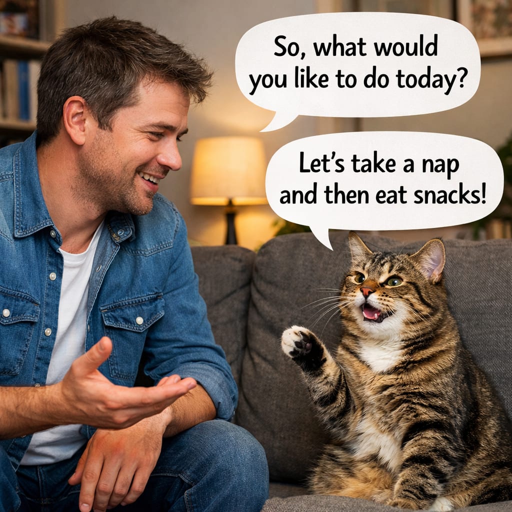 /showme a human asking a Cat what they would like to do and the Cat giving an answer