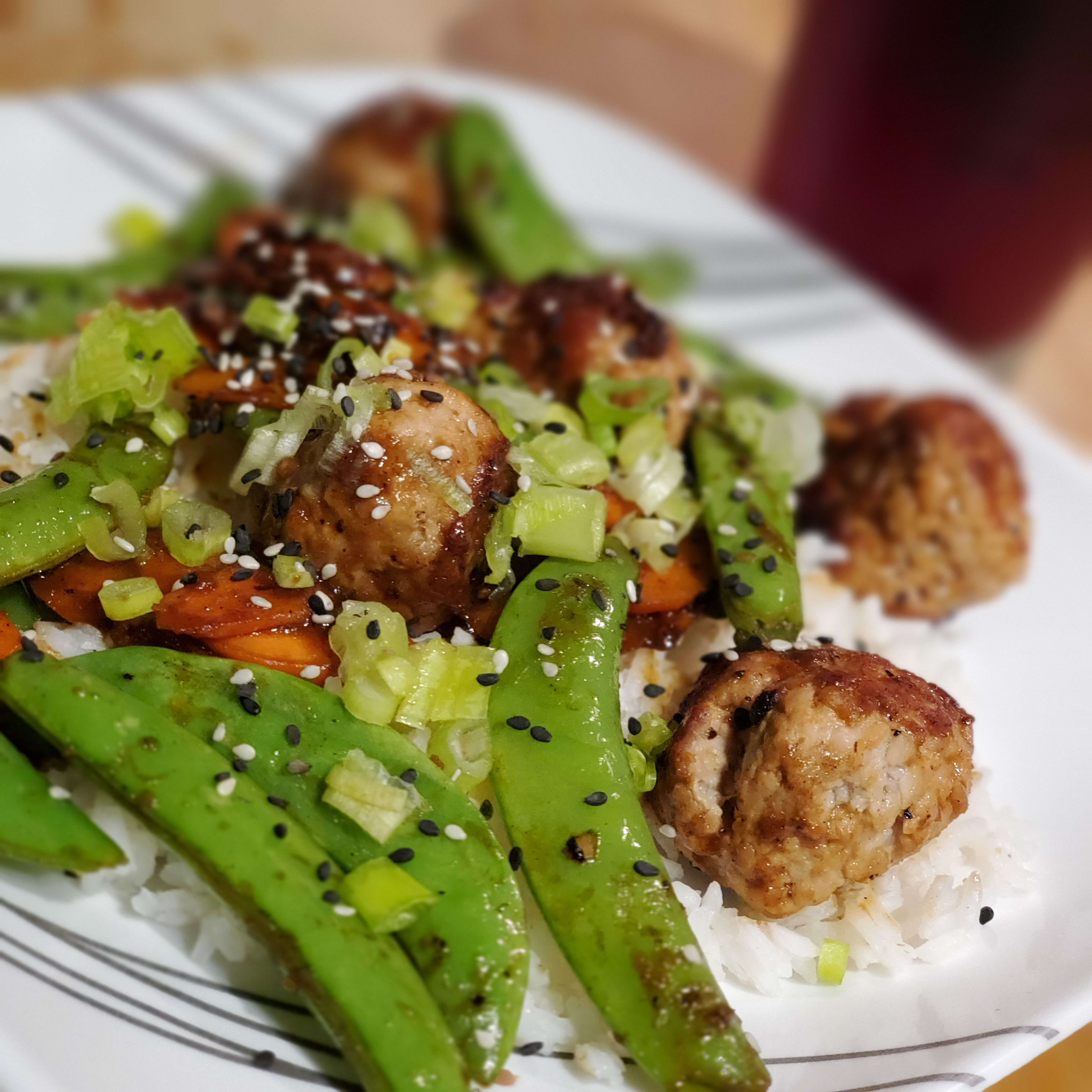 Garlic pork meatballs served with carrots and snap peas over jasmine rice and topped with black and white sesame seeds.