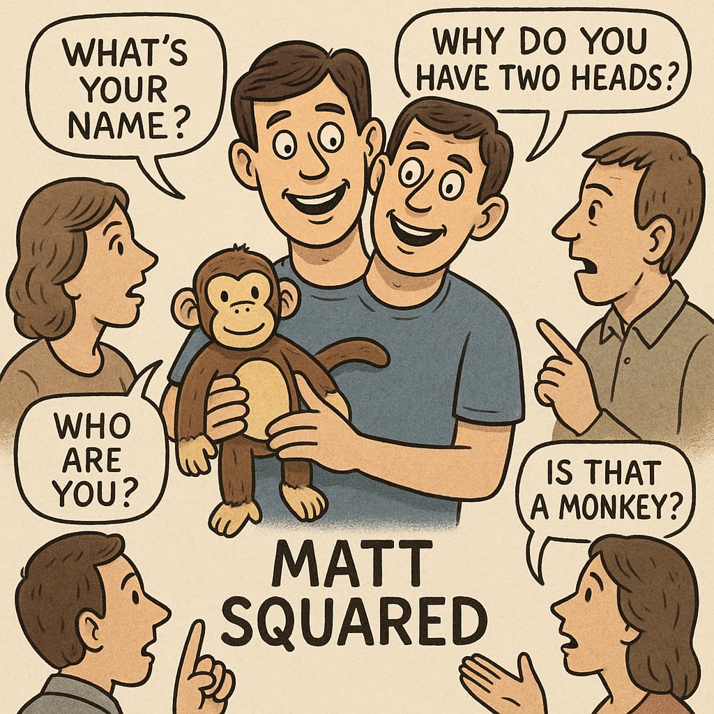 /showme A two headed person named “Matt Squared” holding a monkey doll. Other people surround two headed man named “Matt Squared” and are asking questions.