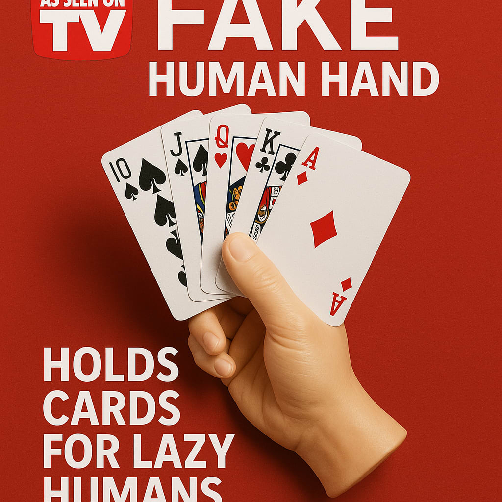 /showme “As Seen On TV” ad trying to sell fake human hand that holds playing cards for lazy humans.