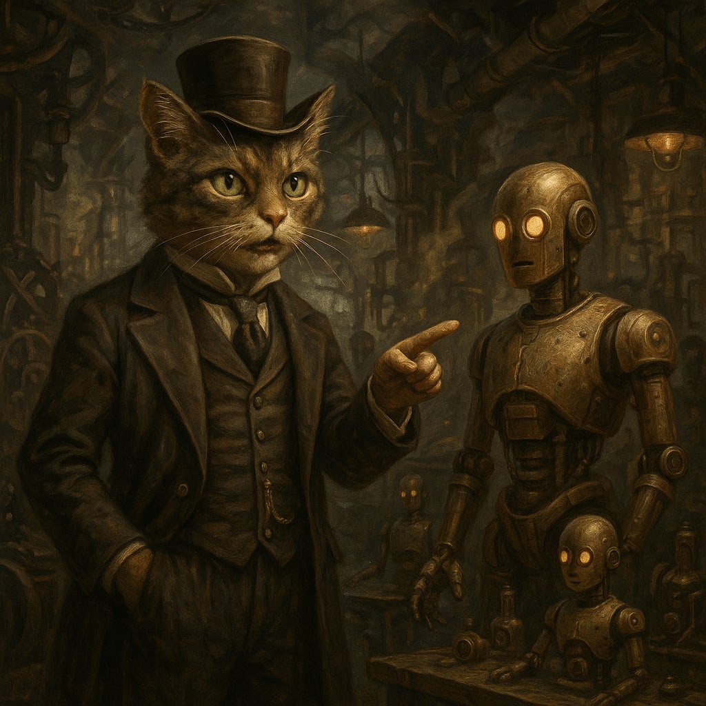 /showme Anthropomorphized cat in Victorian business suit and ordering AI to make more AI in squalid steampunk factory.