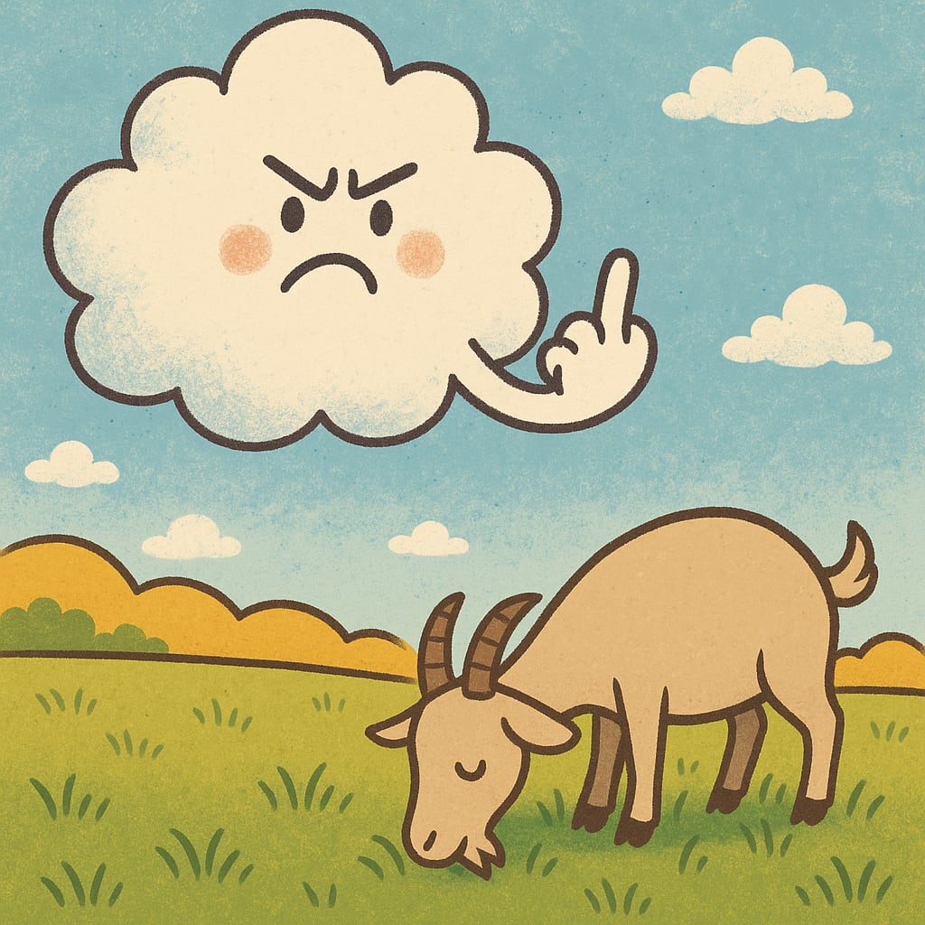 /showme cloud making obscene gesture at goat that is grazing in the field.
