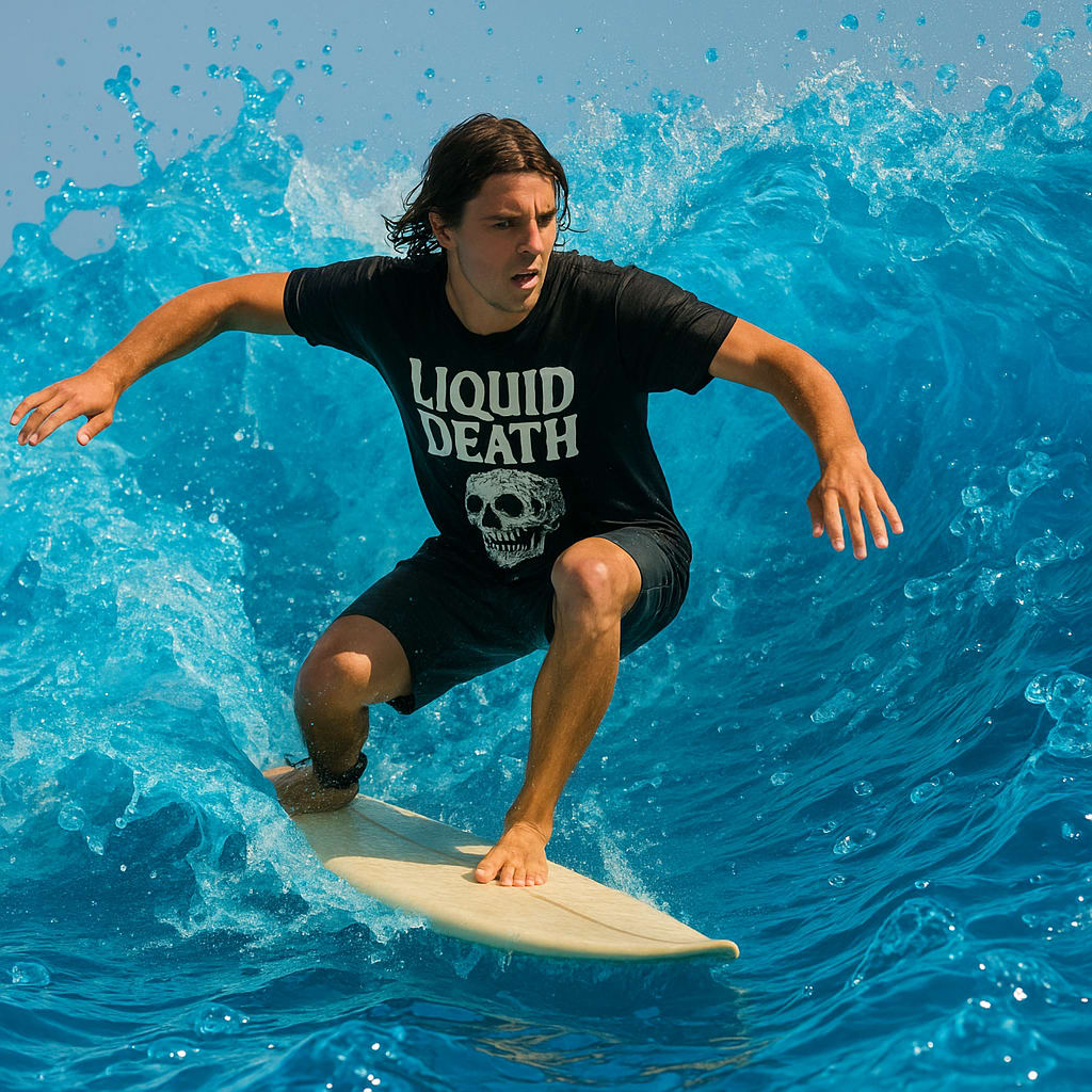 /showme a surfer surfing in an ocean of blue Gatorade with a liquid death shirt