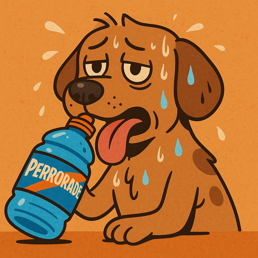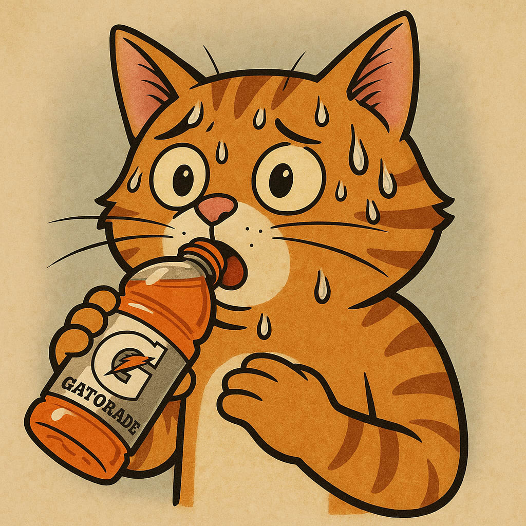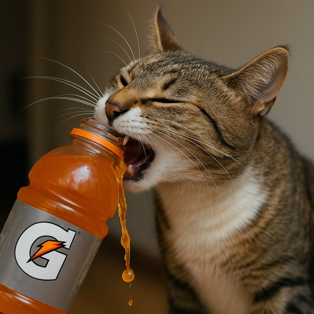 /showme dog sweating and drinking perrorade/showme a cat biting through a Gatorade bottle to drink it
