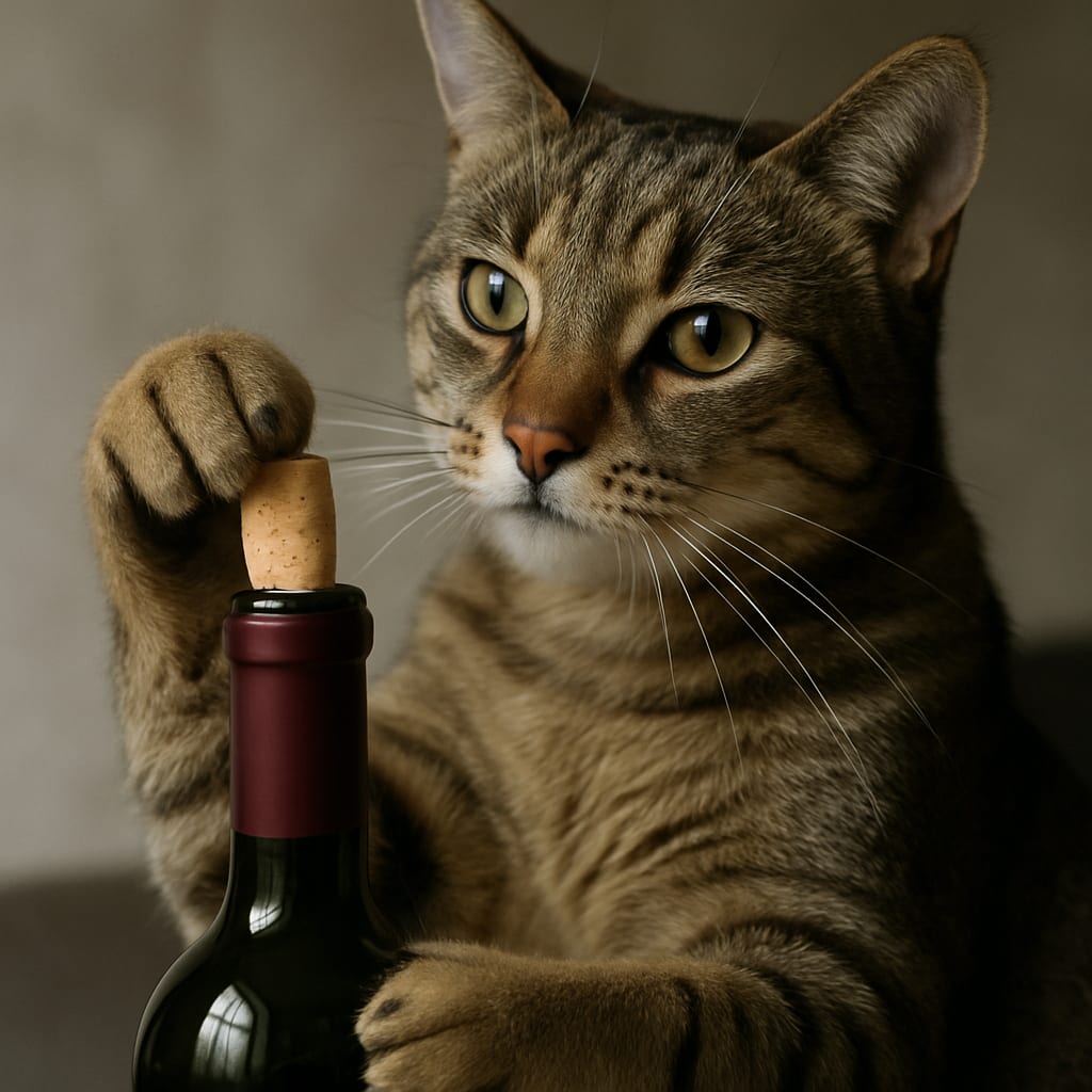 handspaws./showme a photorealistic housecat with a hand on one of their arms that has fingers and a thumb uncorking a bottle of wine