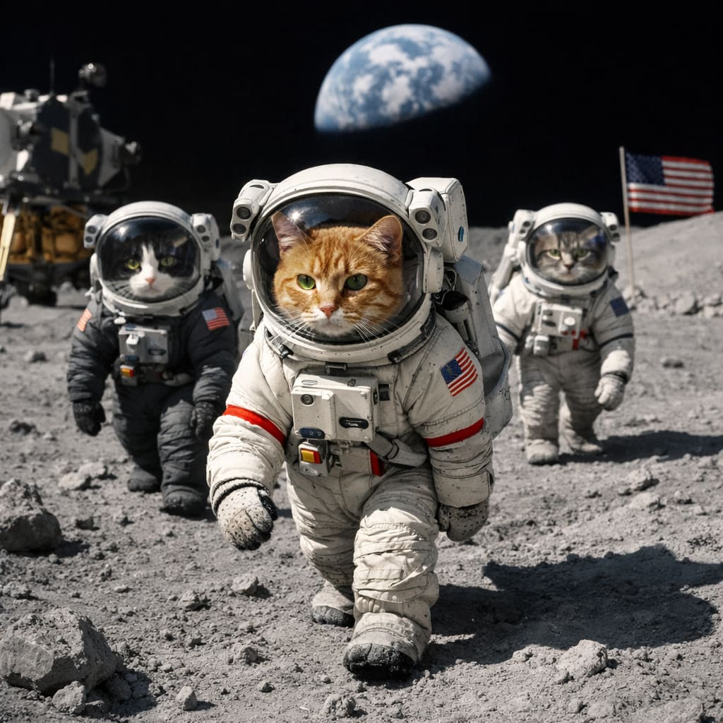 @mycya4me Here’s the image you requested for “cats in spacesuits walking on the moon”