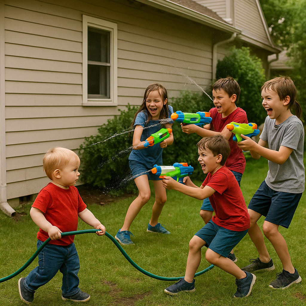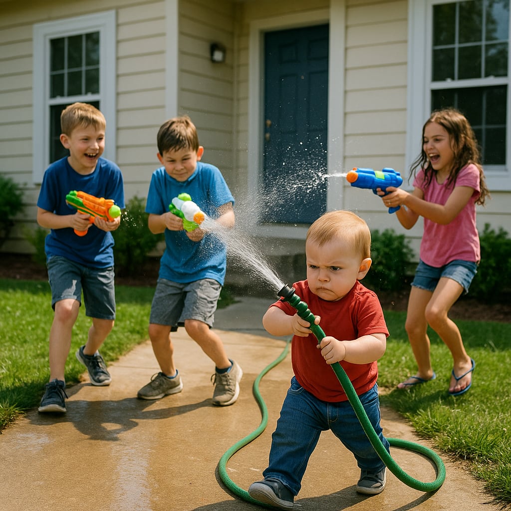 /showme a small child dragging a hose around a house to spray a bunch of 8-year-olds who are shooting each other with super soaker squirt guns