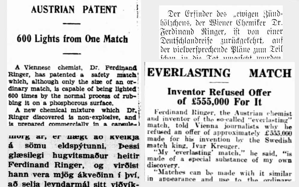 “THE MATCH WHICH WILL LIGHT 600 TIMES,” proclaimed the June 5, 1931 edition of the Ripley’s Believe It or Not syndicated newspaper feature. “Dr. Ferdinand Ringer’s invention of the ‘eternal match’, which I saw during my stay in Vienna, will play havoc with the financial arrangements” of the match industry, the column continued. “I shall watch with interest the further developments in that field.”