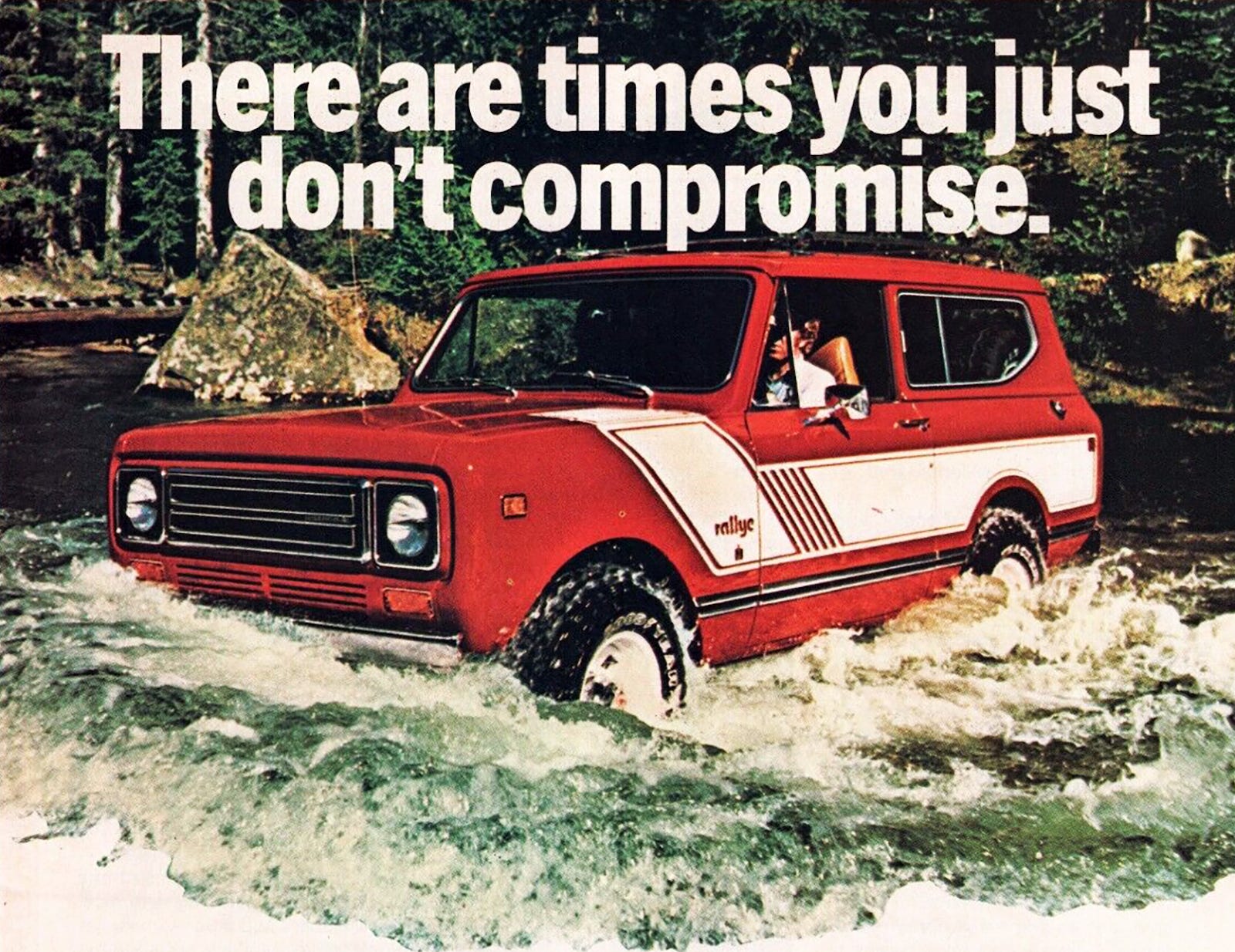 By the '70s, rather than the hybrid work/family vehicle they’d initially envisioned, the Scout was marketed as the ultimate recreational vehicle, equally surefooted chilling on the beach or rumbling through dusty arroyos. Some great TV commercials urged the Scout-curious to “Scout the America others pass by” and gloated about its ability to drive around all the other schmucks stuck in the snow.
