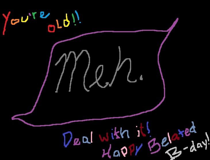 Open a drawing program like Microsoft Paint (Mac users, download Sketchbook Express [free] or another similar program) and HAND DRAW Meh a belated birthday "card". That's right kiddos, we're going to get out the coloring books. And, no, we don't have to stay within any lines. After you've drawn your "card", save it and then upload it to any number of free image hosting services and post a link to it by replying to this post. (If you need further instructions on how to accomplish this, Google is your friend and truly, this is really easy - if you get stuck, ask @JonT for help [you see what I did there?]). I'd assume that this thread is going to look like an elementary school classroom wall when we're done - and that's really the desired outcome!