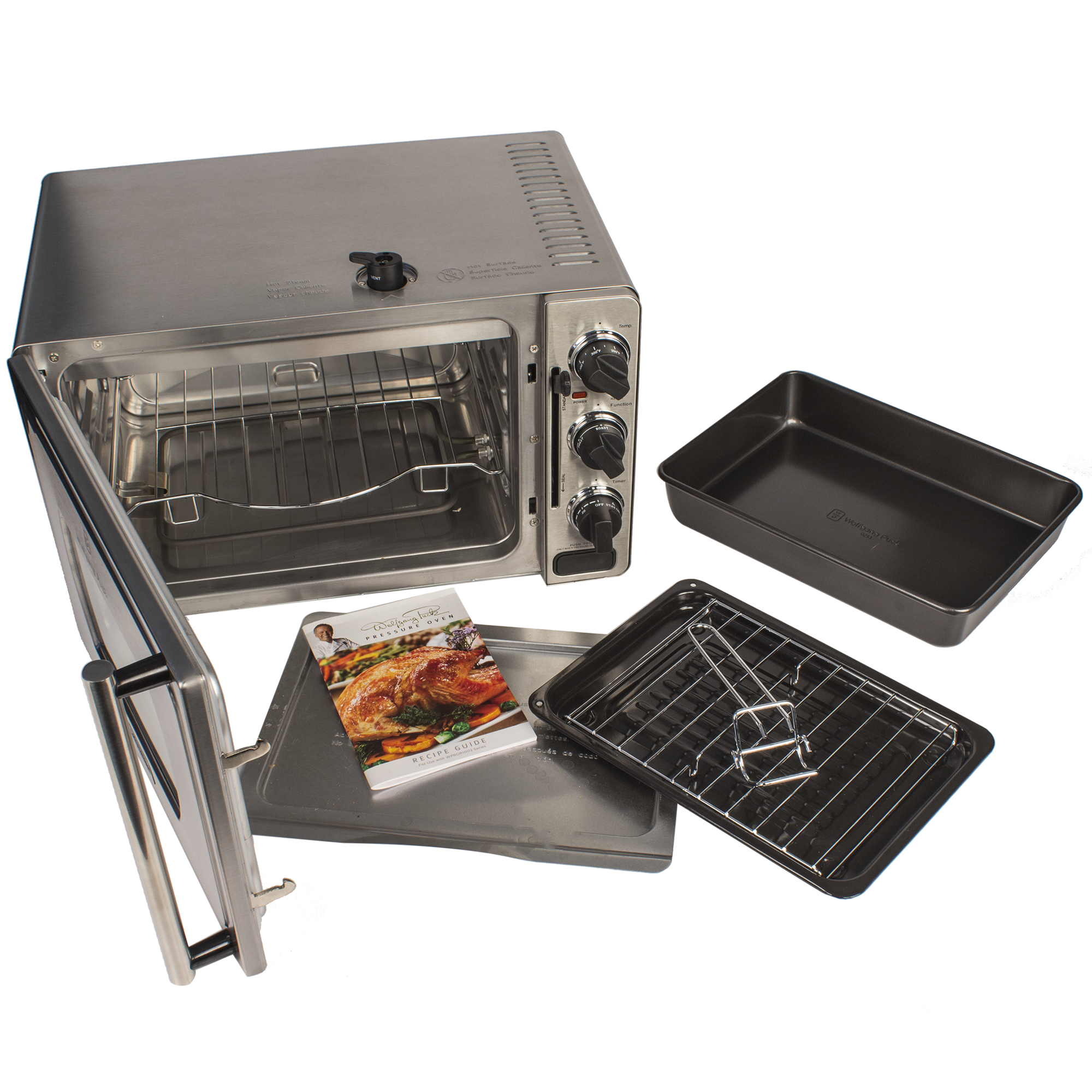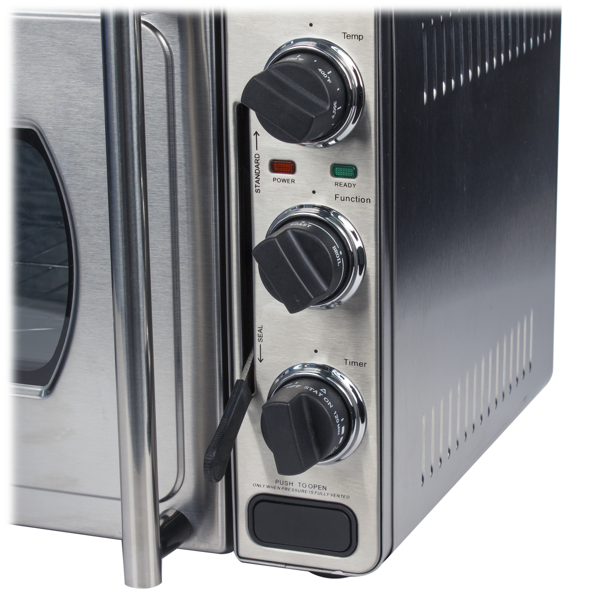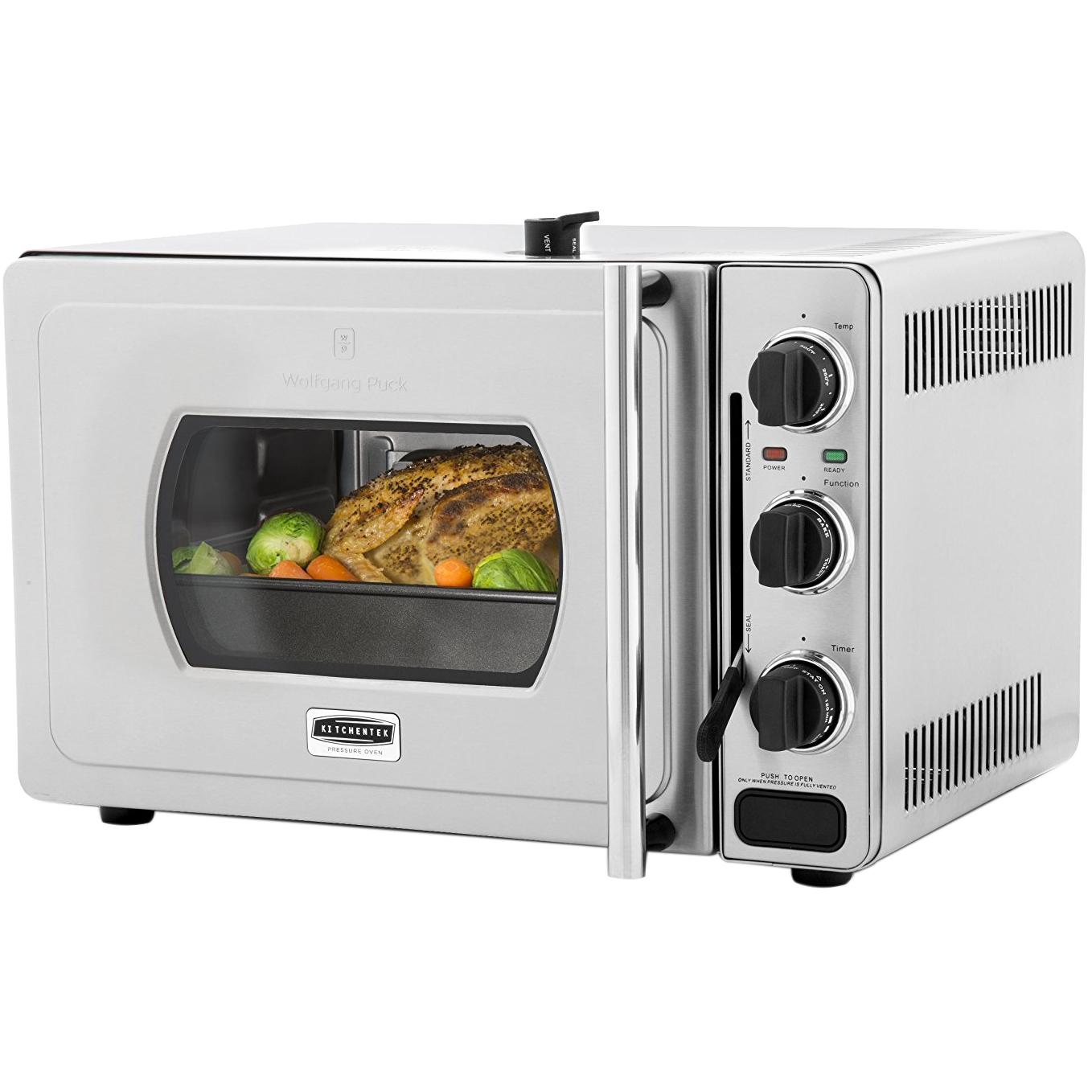 Specs ====- Model: WPROR1002- Condition: New- Fits up to a 14lb. turkey or 12 pizza- Pressure oven that roasts, bakes, broils, toasts, and re-heats- Built-in timer with auto shut-off and manual thermostat- Material: Stainless steel- Weight: 26.7lb.- Product dimensions: 19.9x15.9x12.4- User manualCNET video reviewWhat’s in the Box? ====1x Pressure Cooker1x Baking rack1x Broiling rack1x Roasting pan1x Crumb tray1x Rack removal toolPictures====OvenStuffKnobsFoodWolfgang Amadeus PuckzartWhy no please stopPrice Comparison====$249.99 List, $119.99 at Amazon