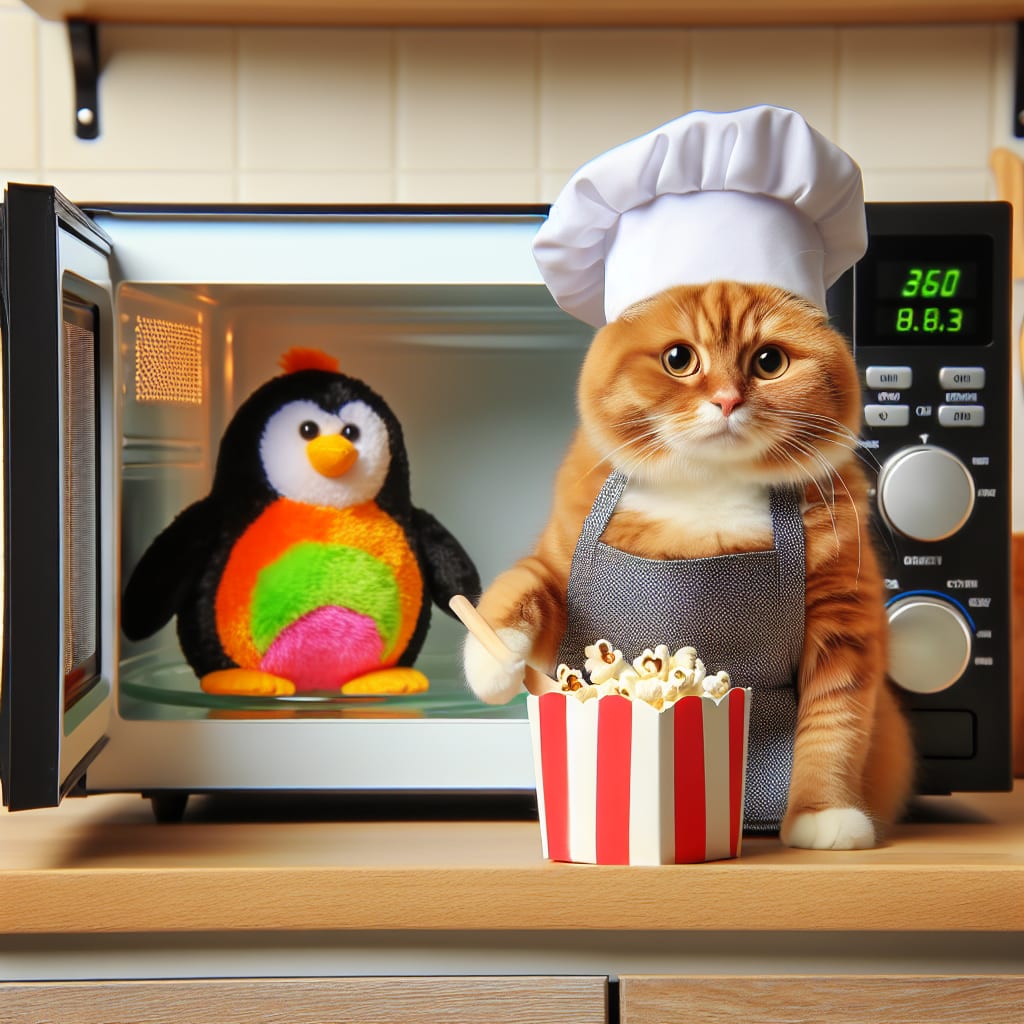 /showme a cat cooking a penguin and popcorn in a microwave.