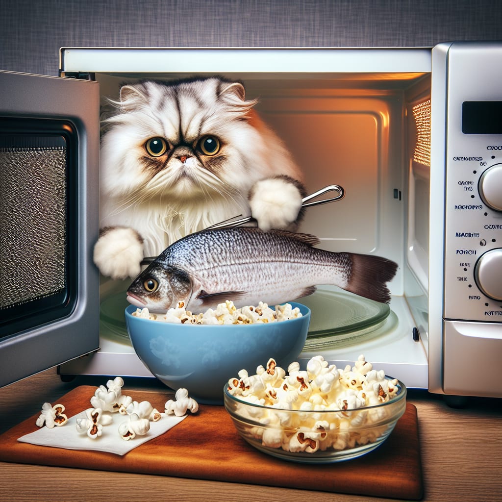 /showme a cat trying to cook Fish & Popcorn in a Microwave.
