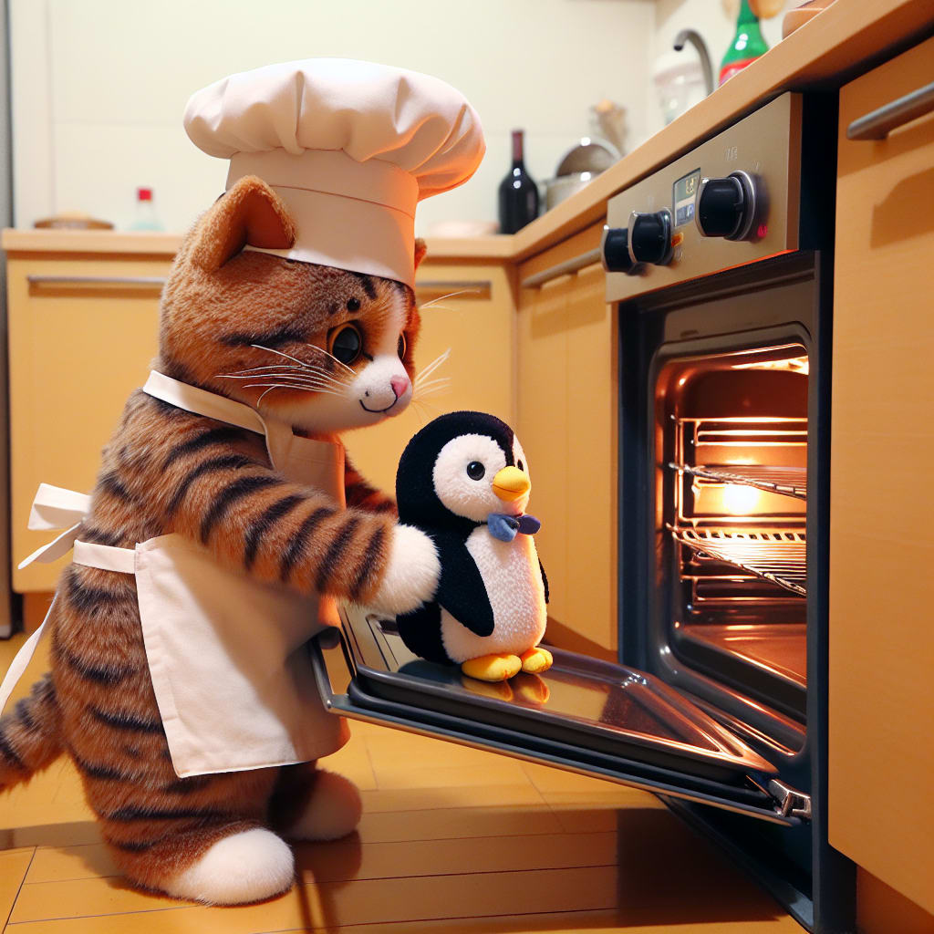 /showme a cat chef placing a penguin into the oven