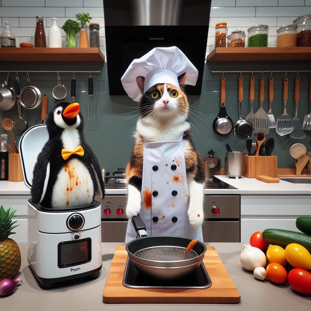 /showme a cat chef about to put a penguin into a deep fryer