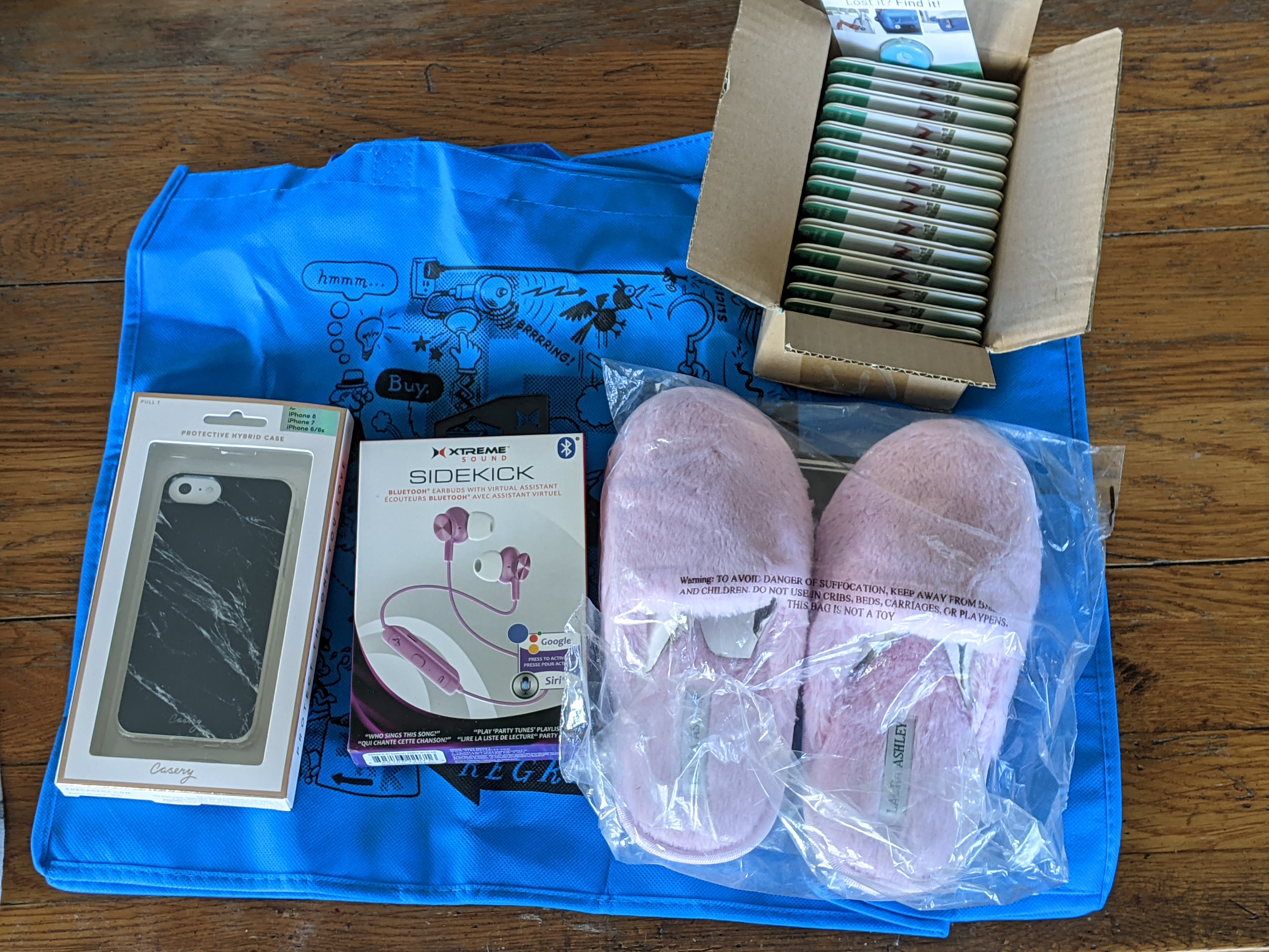 IRK Contents: Big stack of Meh stickers, Pumpkin spice cups, COCO charcoal teeth cleaning stuff, Some kind of Fabric Wrap with Holes but No Buttons that wants to know how you’ll wear it, iPhone screen protectors, Sidekick bluetooth earbuds, Blue IRK bag #2
